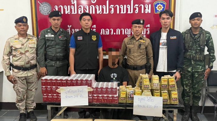 กาญจนบุรี ผกก.สังขละบุรี นำทีมบุกค้นห้องเช่า ยึดบุหรี่เถื่อนจากพม่าค่าเกือบ 2 ล้าน