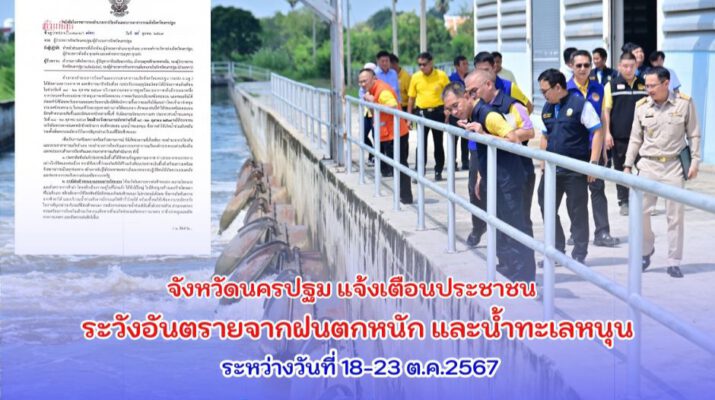 จังหวัดนครปฐม แจ้งเตือนประชาชนระวังอันตรายจากฝนตกหนัก และน้ำทะเลหนุน ระหว่างวันที่ 18-23 ต.ค.2567