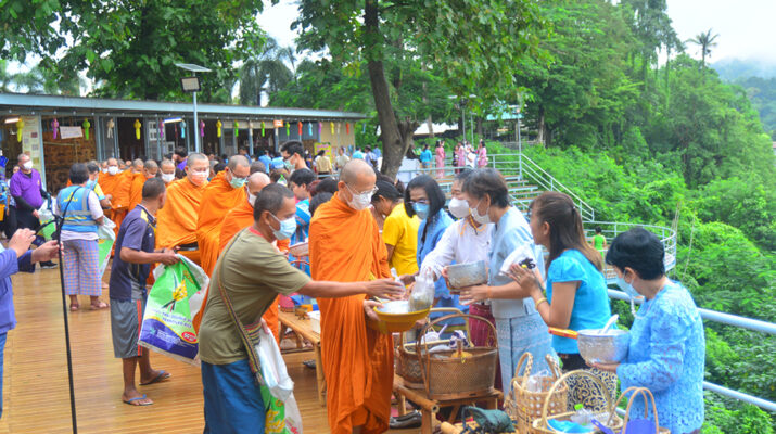 กาญจนบุรี วัดท่าขนุนเทศบาลฯและชุมชน เชิญชวน เสาร์ใส่บาตร ตลาดริมแคว