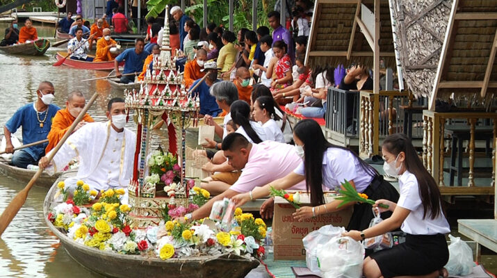 สุพรรณบุรี วันหยุดสาธุชนนักท่องเที่ยวแห่ตักบาตรทางน้ำสวนกล้วยคึกคัก