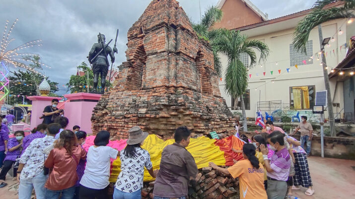 สุพรรณบุรี สืบสานประเพณีแห่ผ้า8สีห่มเจดีย์เก่าสมัยกรุงศรีอยุธยาคึกคัก