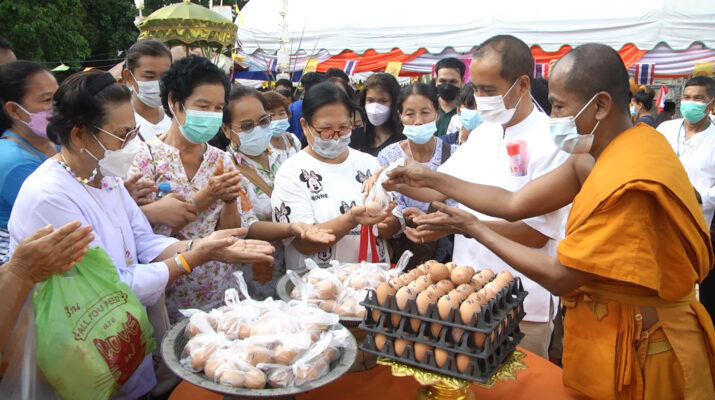 สุพรรณบุรี แห่รับแจกไข่ไก่เงินแบ๊งค์20บาทลงยันต์พิธีเททองหล่อพระประธาน