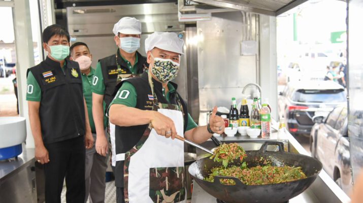 กาญจนบุรี รมต.วราวุธ ผัดกระเพราแจก จนท.ปฏิบัติงานเตรียมการรับเสด็จฯ