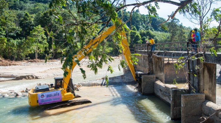 ตรัง อบจ.นำรถแบ็คโฮ เปิดทางน้ำฝายคลองห้วยสอ