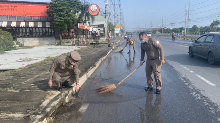 นครปฐม ชาวบ้านชื่นชม ผกก.สภ.สามพราน ลงมือเก็บขยะระบายน้ำขังถนน