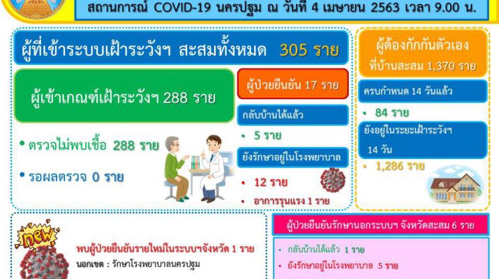 สถานการณ์ COVID-19 จ.นครปฐม ประจำวันที่ 4 เม.ย 63 พบผู้ป่วยยืนยันรายใหม่ 1 ราย อยู่นอกเขต จว.แต่มารักษาตัวที่ รพ.นครปฐม