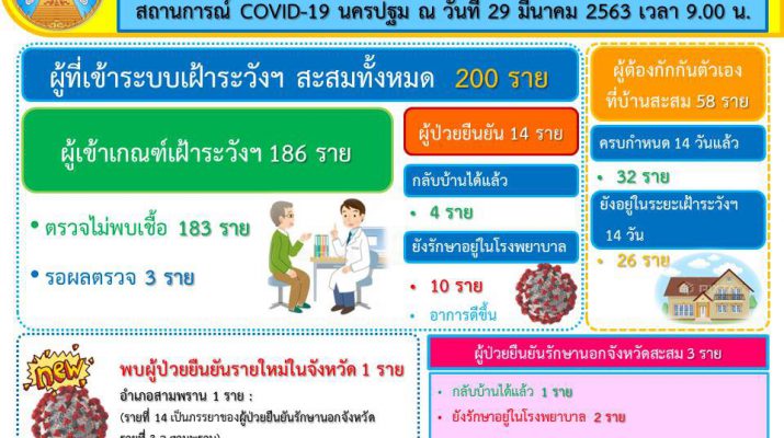 สถานการณ์ COVID-19 จังหวัดนครปฐม ประจำวันที่ 29 มีนาคม 2563 พบผู้ติดเชื้อเพิ่มขึ้นอีก 1 ราย