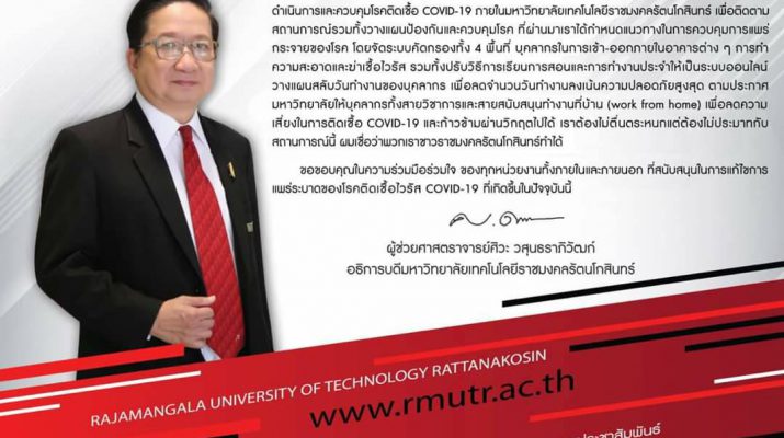 อธิการบดี มทร.รัตนโกสินทร์ ส่งสารแสดงความห่วงใยบุคลากรและนักศึกษา ในสถานการณ์การแพร่ระบาดไวรัส COVID-19
