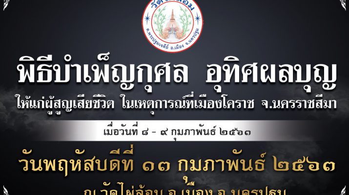นครปฐม วัดไผ่ล้อมขอเชิญร่วมพิธีบำเพ็ญกุศล อุทิศผลบุญ ให้แก่ผู้สูญเสียชีวิต ในเหตุการณ์ ที่ จ.นครราชสีมา