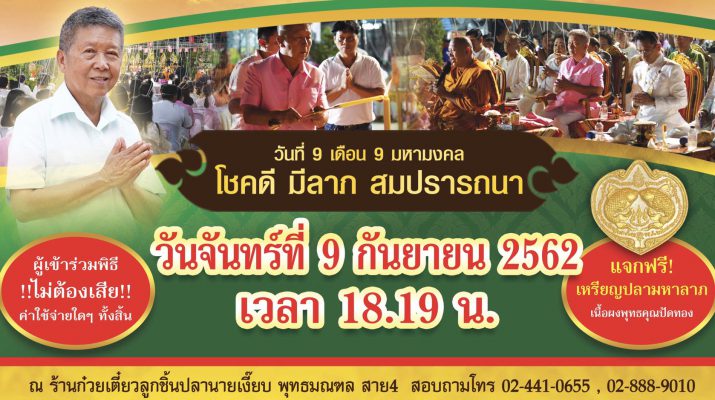 นครปฐม ร้านก๋วยเตี๋ยวลูกชิ้นปลานายเงี๊ยบ พุทธมณฑล สาย 4เชิญร่วมพิธีสวดนพเคราะห์เสริมบารมี ตำรับหลวงพ่อพูล ฟรี วันที่ 9 ก.ย. 62 เวลา 18.19 น.
