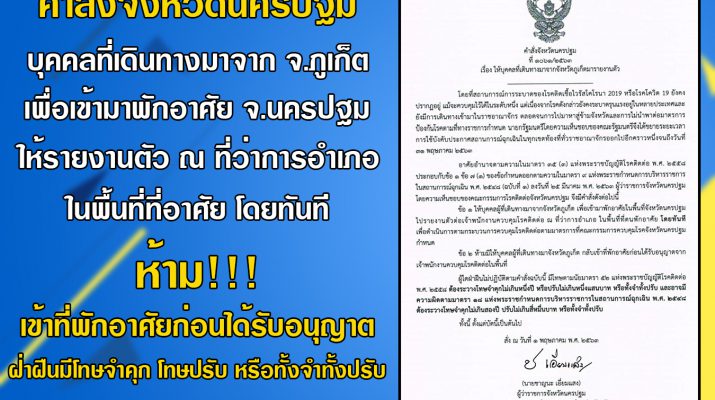 จังหวัดนครปฐม ออกคำสั่งให้บุคคลที่เดินทางมาจากจังหวัดภูเก็ตมารายงานตัว