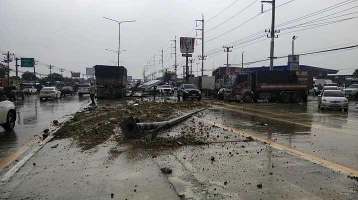 สมุทรสาคร ถนนลื่น รถบรรทุกพ่วง 22 ล้อเสียหลักพุ่งข้ามเกาะกลางถนน