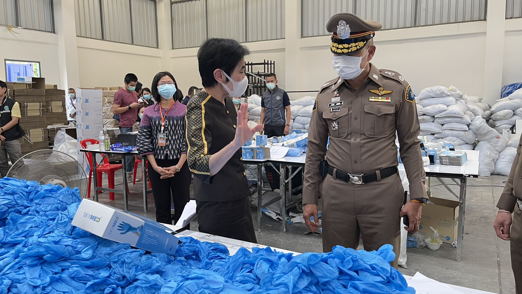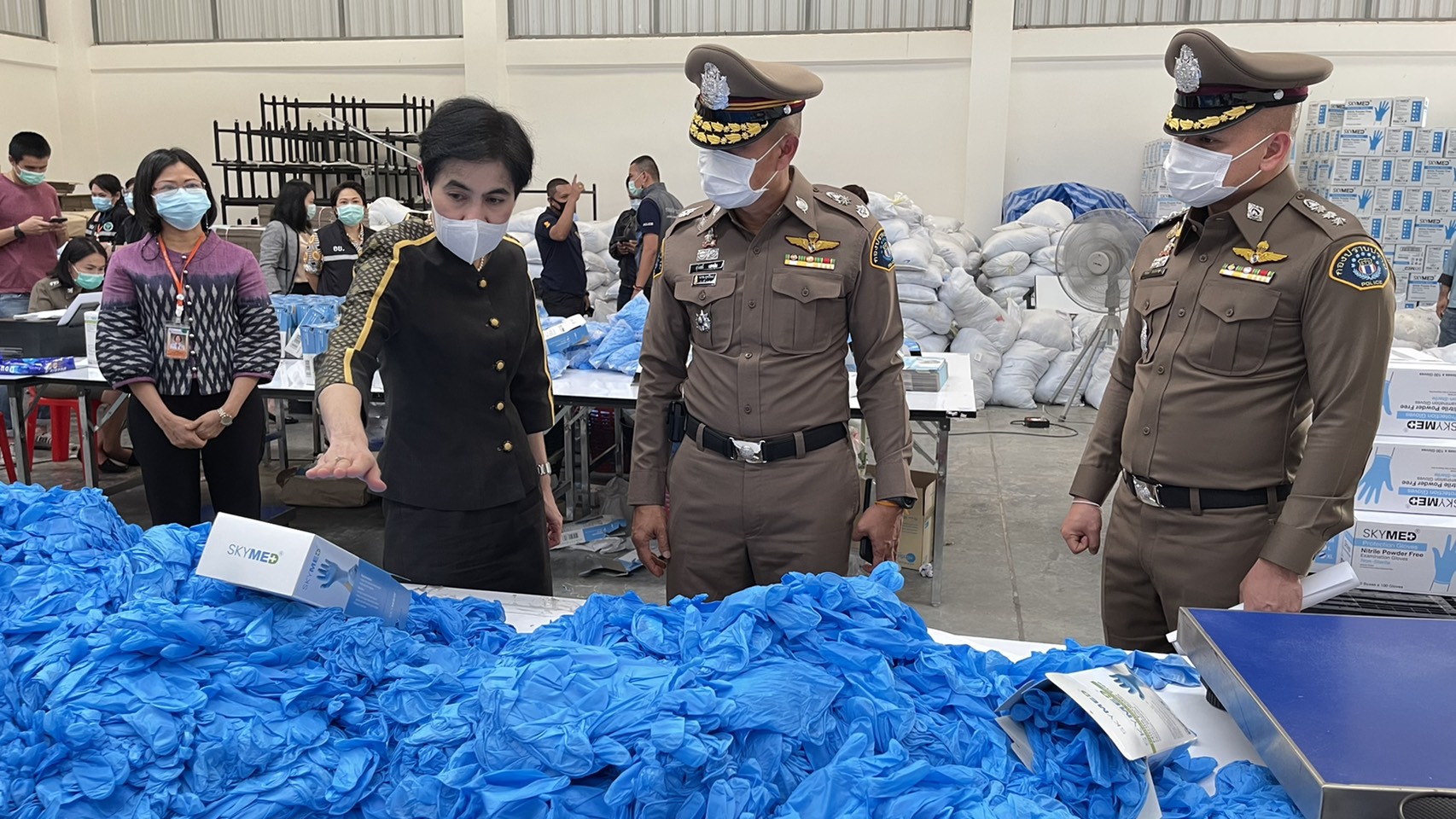 พล.ต.ต.สุวัฒน์ แสงนุ่ม ผบก.ป เปิดเผยว่า การจับกุมครั้งนี้สืบเนื่องจากสถานการณ์การแพร่ระบาดของไวรัสโควิด-19 ทำให้ความต้องการผลิตภัณฑ์เพื่อป้องกันการแพร่ระบาดของเชื้อไวรัสโควิด-19 เพิ่มขึ้นเป็นจำนวนมาก จึงเป็นช่องของผู้ประกอบการที่ขาดคุณธรรมฉวยโอกาส นำผลิตภัณฑ์สุขภาพที่ไม่ได้คุณภาพมาตรฐานมาจำหน่าย โดยไม่คำนึงถึงความปลอดภัยของผู้ใช้ ซึ่งการกระทำดังกล่าวอาจทำให้ประชาชนผู้ใช้ได้รับอันตราย ปัจจุบันมีผู้เสียหายจำนวนหลายราย ได้เข้ามาร้องเรียนที่ กองบังคับการปราบปราม ว่าได้มีกลุ่มมิจฉาชีพ หลอกลวงอ้างว่าสามารถนำสินค้าประเภทถุงมือยางทางการแพทย์มาจำหน่ายให้ได้เป็นจำนวนมาก โดยมีผู้เสียหาย หลงเชื่อได้มีการวางเงินมัดจำสินค้าประเภทถุงมือยางทางการแพทย์ เป็นจำนวนเงินที่สูง รายละ 40- 50 ล้านบาท แต่กลับไม่ได้รับสินค้าและบางรายได้รับสินค้าที่ไม่มีคุณภาพ เมื่อนำส่งออกไปต่างประเทศ ถูกตีคืนสินค้ากลับมายังประเทศไทย ทำให้เกิดเสียหายต่อระบบเศรษฐกิจ ทางกองบังคับการได้ปราบปรามได้ทำการสืบสวนขบวนการหลอกลวงขายสินค้าประเภทถุงมือยางทางการแพทย์ ดังกล่าวอย่างต่อเนื่องจนสืบทราบว่าสถานที่ดังกล่าวได้มีการผลิตและบรรจุ สินค้าประเภทถุงมือยางทางการแพทย์ โดยไม่ได้รับอนุญาต จากสำนักงานคณะกรรมการอาหารและยา กระทรวงสาธารณสุข แต่อย่างใด