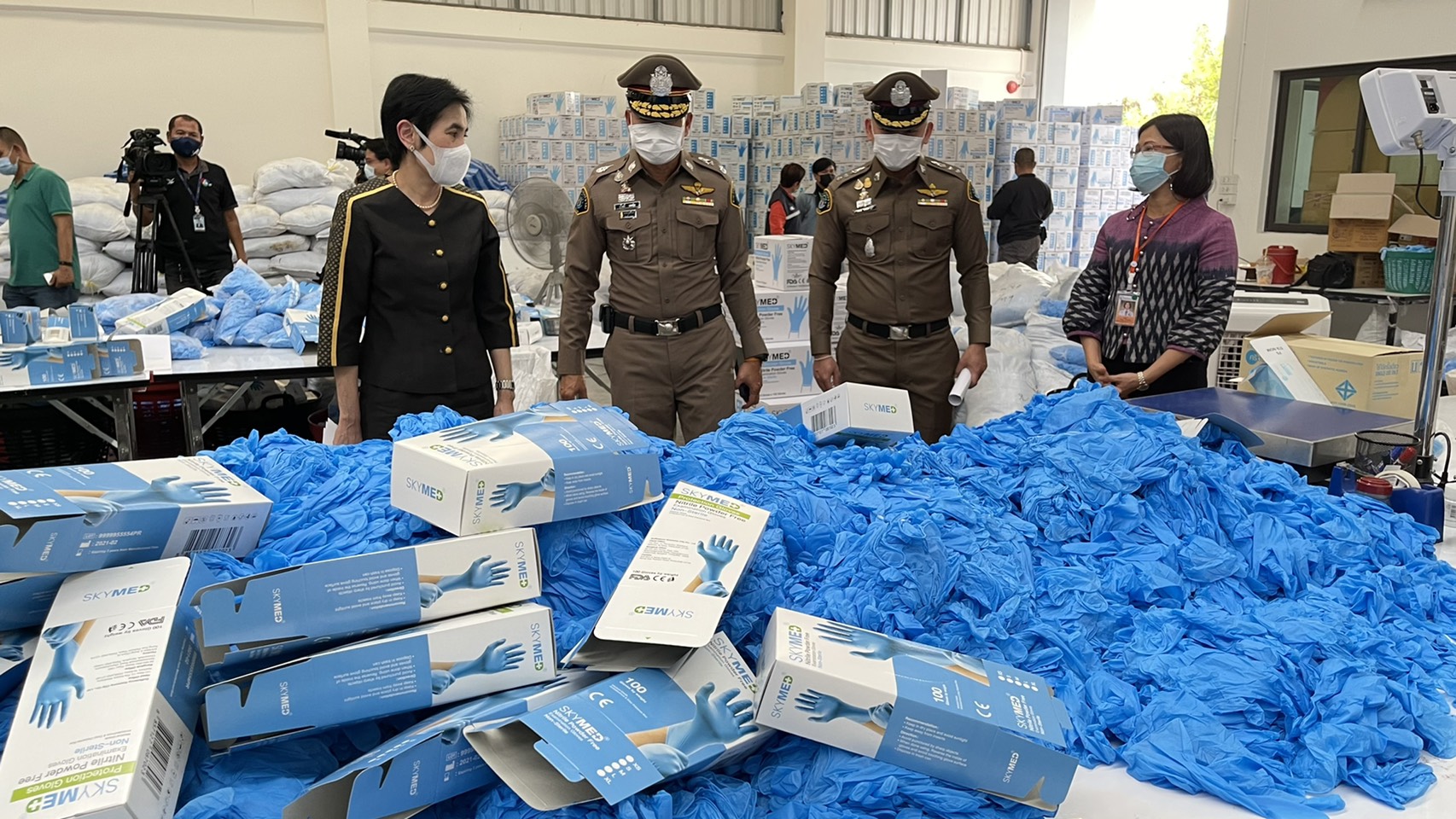 เมื่อเวลา 17.00น.วันที่ 24 มีนาคม2564 พล.ต.ต.สุวัฒน์ แสงนุ่ม ผบก.ป.,พ.ต.อ. มนตรี เทศขัน รอง ผบก.ป.,พ.ต.อ.พุฒิเดช บุญกระพือ รอง ผบก.ป.พ.ต.อ. บุญลือ ผดุงถิ่น ผกก.2 บก.ป.,พ.ต.อ.วิวัฒน์ จิตโสภากุล ผกก.3 บก.ป.เภสัชกรหญิงสุภัทรา บุญเสริม รองเลขาธิการคณะกรรมการอาหารและยา และกำลังเจ้าหน้าที่ตำรวจกองปราบปราม เจ้าหน้าที่อส. พร้อมด้วยหมายค้น ศาลธัญบุรี เลขที่ 148 /2564 ลงวันที่ 24 มีนาคม 2564 เข้าทำการตรวจค้นอาคารเลขที่ เลขที่ 88/7 หมู่ 13 ตำบลลำลูกกา อำเภอลำลูกกา ปทุมธานี 12120 พร้อมจับกุมคนงาน จำนวน 19 คน ชาย 9 คน หญิง 10 คน และทำการตรวจยึด1.ถุงมือยี่ห้อ SKYMED Nitrile Powder Free Examination Gloves size M จำนวน 89ลัง89,000ชิ้น2. ถุงมือยี่ห้อSKYMED Nitrile Powder Free Examination Gloves size L จำนวน 843ลัง843,000ชิ้น3.ถุงมือยี่ห้อ SKYMED Nitrile Powder Free Examination Gloves size XL จำนวน 506 ลัง506,000ชิ้น4. ถุงมือศรีตรังโกลฟส์ Examination Gloves size S จำนวน 2 ลัง2,000ชิ้น5. ถุงมือยางสีฟ้าบรรจุในถุงกระสอบ คละไซร์ จำนวน 607 กระสอบ18,210,000 ชิ้น6.กล่องบรรจุภัณฑ์ SKYMED จำนวน 104ห่อ20,800 ชิ้น7.ลังลูกฟูก SKYMED จำนวน 308 มัด*20ชิ้น=6,160 ชิ้น8.กล่องบรรจุภัณฑ์ศรีตรังโกลฟส์ จำนวน 159 ห่อ*300ชิ้น=47,700 ชิ้น9.ลังลูกฟูก ศรีตรังโกลฟส์ จำนวน 168มัด*20ชิ้น=3,360 ชิ้น
