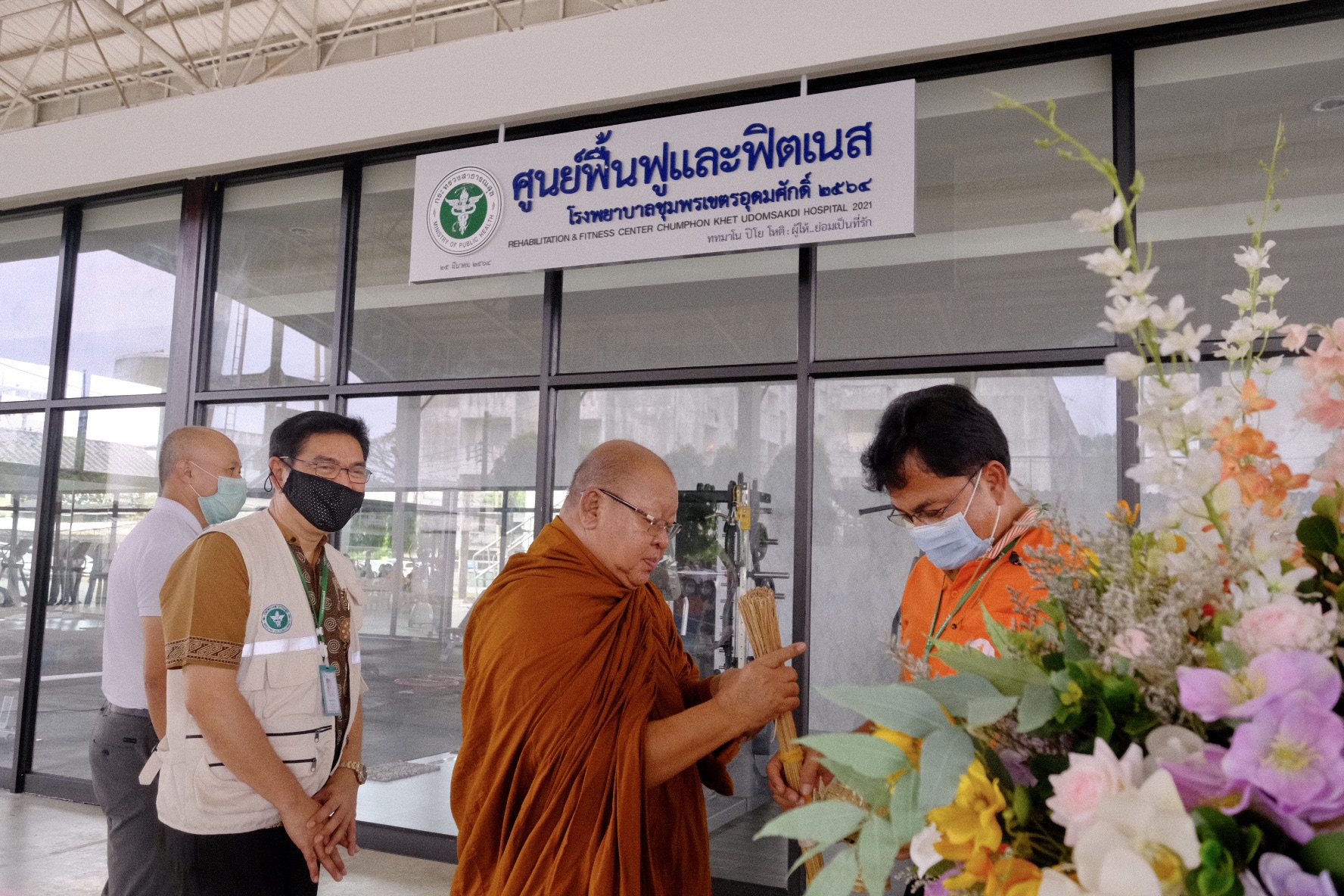 นพ.สวรรค์ กาญจนะ ผู้อำนวยการ รพ.ชุมพรเขตรอุดมศักดิ์ พร้อมด้วย นพ.ฉัตรชัย พิริยะประกอบ รองผู้อำนวยการฝ่ายการแพทย์ ได้กราบนิมนต์ พระครูสุจิณธรรมรส เจ้าอาวาสวัดเข่าบ่อ เจิมป้ายเพื่อเป็นศิริมงคล เปิดศูนย์ฟื้นฟูและฟิตเนส เพื่อเจ้าหน้าที่รพ.ชุมพรฯและประชาชน ทั้งนี้ ได้รับการสนับสนุนเครื่องมือโดยนาย จิรันธนิน รอดทับ ผู้จัดการฝ่ายขายบริษัทเซียร่าและกรรมการบริษัทฟิตเนสมาสเตอร์จำกัด เพื่อส่งเสริมให้มีการออกกำลังกายเพื่อลดความเสี่ยงของโรคอ้วน โรคความดันโลหิตสูง โรคหลอดเลือดสมอง และฟื้นฟูผู้ป่วยให้กลับมาแข็งแรงมีสุขภาพกายและ ใจที่ดี