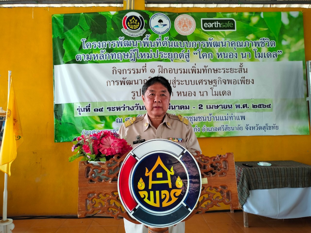 นายปริญญา ตังคณานุกูลชัย ปลัดอาวุโสอำเภอเมืองสุโขทัย กล่าวว่า จังหวัดสุโขทัยขับเคลื่อนโครงการพัฒนาพื้นที่ต้นแบบการพัฒนาคุณภาพชีวิตตามหลักทฤษฎีใหม่ ประยุกต์สู่ “โคก หนอง นา พช.” กิจกรรมที่ 1 ฝึกอบรมเพิ่มทักษะระยะสั้นการพัฒนากสิกรรมสู่ระบบเศรษฐกิจพอเพียง รูปแบบ โคก หนอง นา พช. ณ ปัจจุบันเป็นรุ่นที่ 14 อบรม ณ ศูนย์ศึกษาการพัฒนาชุมชน(อาศรมพระธรรมจาริก) โดยมีกลุ่มเป้าหมายสำคัญ 2 กลุ่ม ประกอบด้วย นักพัฒนาพื้นที่ต้นแบบ (นพต.) และครัวเรือนต้นแบบการพัฒนาคุณภาพชีวิต สำหรับการฝึกอบรมทั้ง 5 วัน 4คืน มุ่งหวังให้กลุ่มเป้าหมายทั้ง 119 คน ได้เรียนรู้การน้อมนำหลักปรัชญาของเศรษฐกิจพอเพียงประยุกต์สู่การปฏิบัติในรูปแบบ”โคก หนอง นา พช.” ด้วยความเข้าใจอย่างแท้จริงและปฏิบัติได้จริง สามารถนำองค์ความรู้ที่ได้รับไปพัฒนาพื้นที่ของตนเอง และชุมชนตามหลักปรัชญาของเศรษฐกิจพอเพียง โดยเชื่อมั่นว่าการน้อมนำพระราชดำริของพระบาทสมเด็จพระบรมชนกาธิเบศร มหาภูมิพลอดุลยเดชมหาราช บรมนาถบพิตร ที่ทรงพระราชทานหลักปรัชญาของเศรษฐกิจพอเพียงและทฤษฎีใหม่ จะเป็นหลักยึดในการดำเนินชีวิตและรอดพ้นวิกฤตปัญหาเศรษฐกิจในปัจจุบันจากผลกระทบสถานการณ์การแพร่ระบาดของเชื้อไวรัสโคโรนา 2019 (COVID-19) ได้และที่สำคัญที่จะทำให้ให้ชุมชนเกิดการพัฒนาอย่างแท้จริงนำไปสู่ ความมั่นคง มั่งคั่ง และยั่งยืนในชุมชน