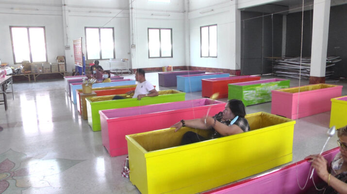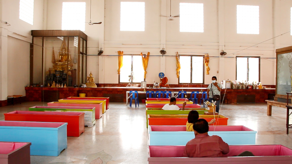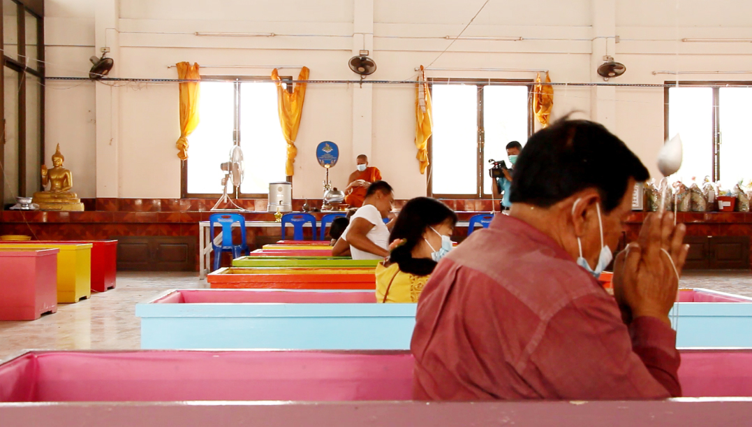ทางด้านนายวีระเดช หมอนเมือง อายุ 70 ปีชาวบ้าน อ.ลาดหญ้า จ.กาญจนบุรี กล่าวว่าวันนี้พาครอบครัวมาทำบุญที่วัดเถรพลายเพื่ออุทิศส่วนกุศลให้กับบรรพบุรุษและเจ้ากรรมนายเวร พร้อมกันนี้ก็ได้ทำพิธีสะเดาะเคราะห์ต่อชะตาให้สิ่งไม่ดีหมดไปเพื่อเสริมดวง การที่เข้าไปนอนในโลง8สีให้พระสงฆ์บังสุตายบังสุกุลเป็น นั้นเหมือนเป็นการตายแล้วเกิดใหม่ เหมือนเราได้ชีวิตใหม่ที่ดีขึ้นกว่าเก่า