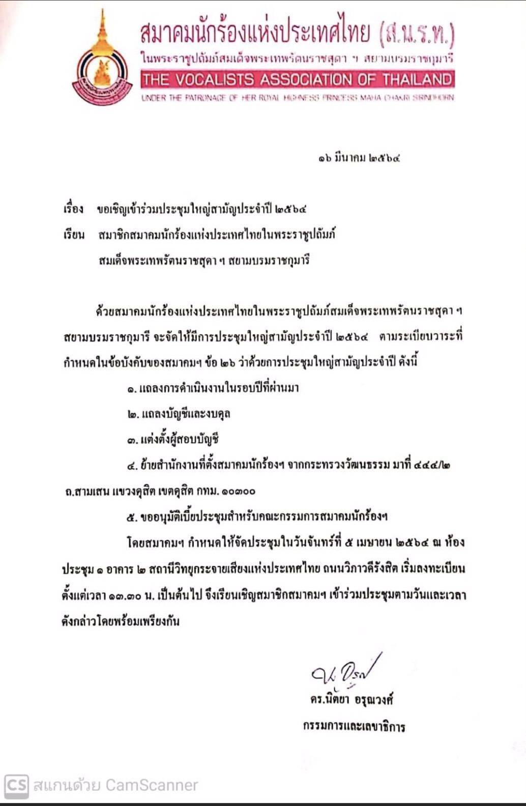 โดยสมาคมฯ กำหนดให้จัดประชุมในวันจันทร์ที่ 5 เมษายน 2564 ณ ท้องประชุม 1 อาคาร 2 สถานีวิทยุกระจายเสียงแห่งประเทศไทย ถนนวิภาวดีรังสิต เริ่มลงทะเบียน ตั้งแต่เวลา 13.30 น.เป็นต้นไป จึงเรียนเชิญสมาชิกสมาคมฯ เข้าร่วมประชุมตามวันและเวลาตังกล่าวโดยพร้อมเพรียงกัน ลงนามโดย ดร.นิตยา อรุณวงศ์ กรรมการและเลขาธิการ