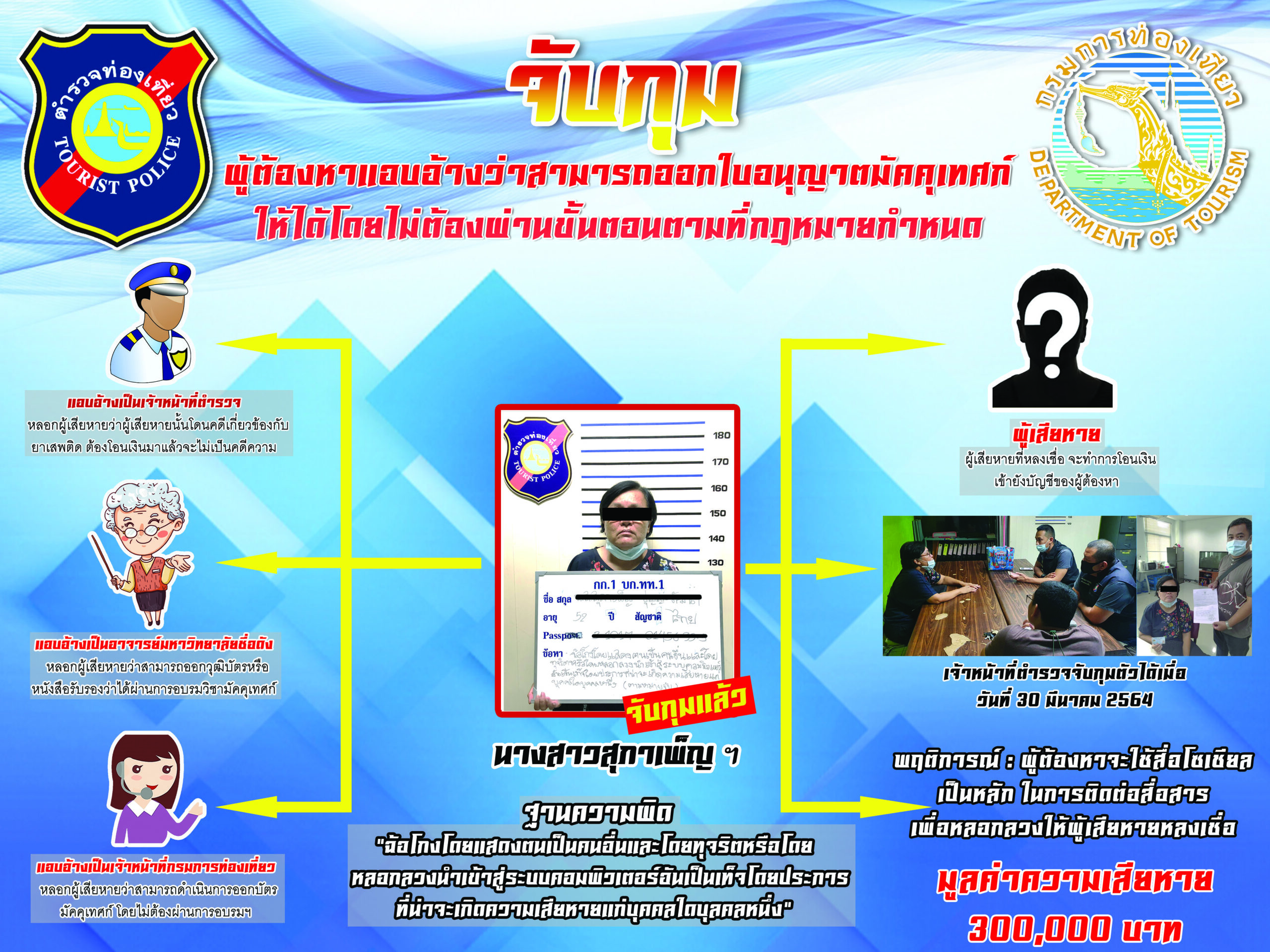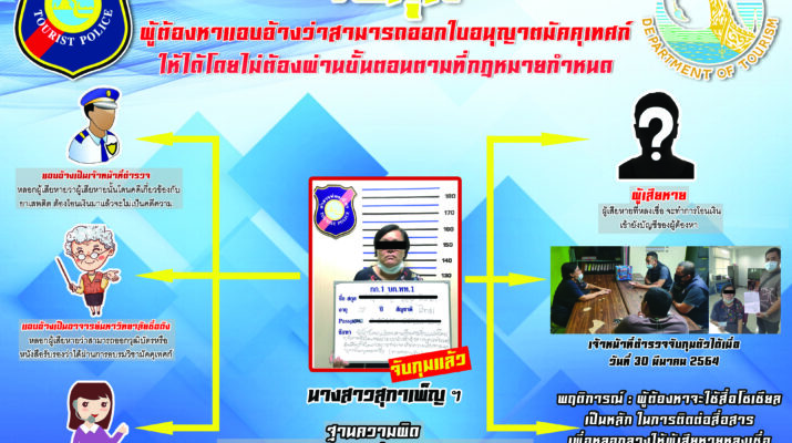 *****จากการสอบสวน น.ส.สุภาเพ็ญ (ขอสงวนนามสกุล) อายุ 52 ปี ทราบว่า ผู้ต้องหาผู้ต้องหามีพฤติกรรมแอบอ้างเป็นเจ้าหน้าที่ของหน่วยงานต่างๆที่เกี่ยวข้องกับการดำเนินการขอใบอนุญาตประกอบอาชีพมัคคุเทศก์ เช่น เจ้าหน้าที่กรมการท่องเที่ยว , เจ้าหน้าที่ตำรวจ และอาจารย์ของมหาวิทยาลัย (ซึ่งมีหลักสูตรเกี่ยวกับอาชีพมัคคุเทศก์) เพื่อให้เกิดความน่าเชื่อถือ และหลอกลวงโดยใช้วิธีการโฆษณาประกาศข้อความผ่านทางเฟสบุค และช่องทางอื่นตามเว็บไซต์ต่างๆ โดยอ้างว่าตนสามารถออกใบอนุญาตมัคคุเทศก์(บัตรไกด์)ได้ เมื่อมีผู้สนใจ ผู้ต้องหาก็จะทำการติดต่อพูดคุยรายละเอียดผ่านทางโทรศัพท์และแอปพลิเคชันไลน์ จนสามารถทำให้ผู้เสียหายหลงเชื่อว่าผู้ต้องหาสามารถติดต่อประสานงาน เพื่อให้สามารถออกใบอนุญาตมัคคุเทศก์ (บัตรไกด์)ได้โดยไม่ต้องผ่านขั้นตอนตามหลักเกณฑ์ที่กฎหมายกำหนดจนมีผู้เสียหายหลงเชื่อโอนเงินไปที่บัญชีธนาคารของผู้ต้องหา จำนวนหลายครั้ง รวมมูลค่าความเสียหายเป็นเงินจำนวนกว่า 300,000 บาท และหลังจากผู้เสียหายโอนเงินไปแล้ว ปรากฏว่าผู้ต้องหาไม่สามารถออกใบอนุญาตมัคคุเทศก์ได้จริงตามที่กล่าวอ้าง ผู้เสียหายจึงทราบว่าถูกหลอกลวงและได้เข้าแจ้งความร้องทุกข์ต่อเจ้าหน้าที่ตำรวจ จนกระทั่งเจ้าหน้าที่ตำรวจงานสืบสวน กก.1 บก.ทท.1 ได้จับตัวกุมได้ที่ บริเวณ สน.ปทุมวัน แขวงวังใหม่ เขตปทุมวัน กรุงเทพมหานคร โดยจากการตรวจสอบประวัติพบว่า นางสาวสุภาเพ็ญฯ เคยต้องโทษในคดีลักทรัพย์ ในพื้นที่ สน.ห้วยขวาง , สน.ลาดพร้าว และ สน.ทองหล่อ มาก่อนอีกด้วย