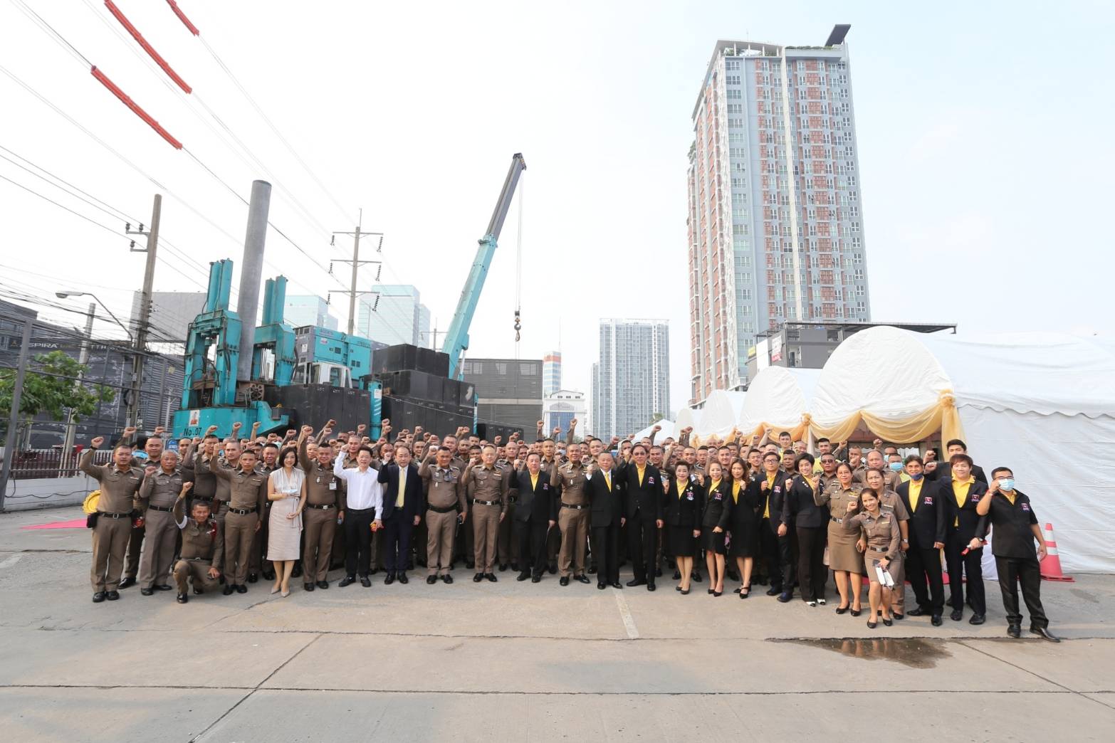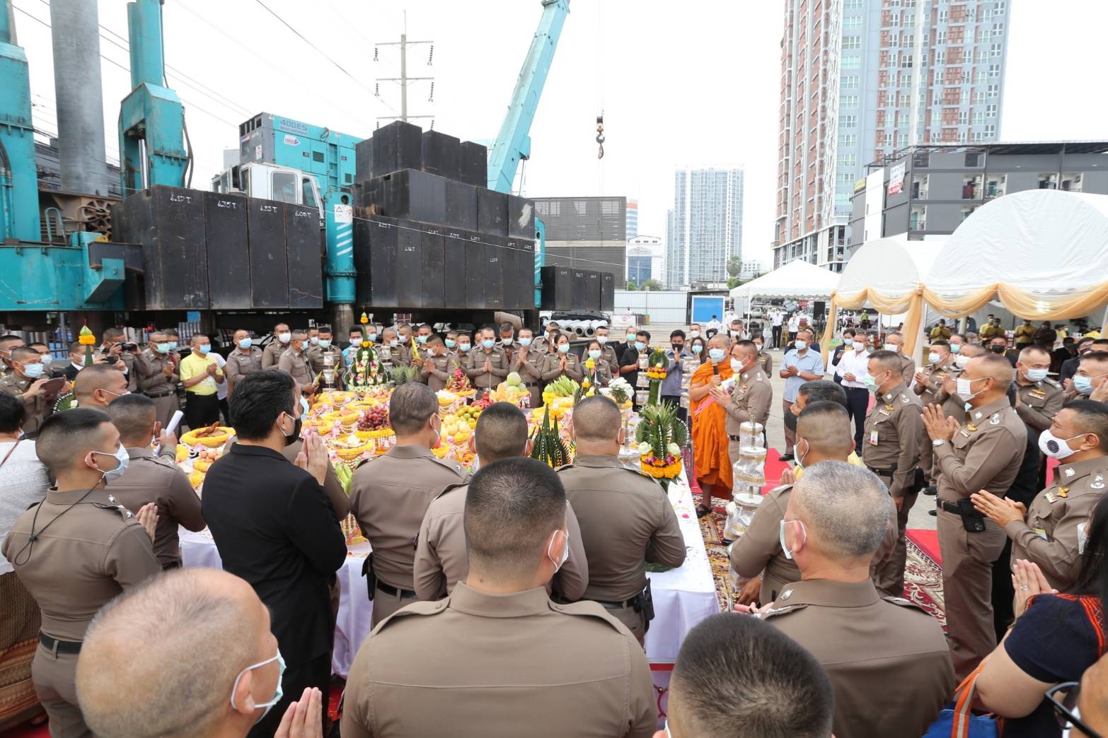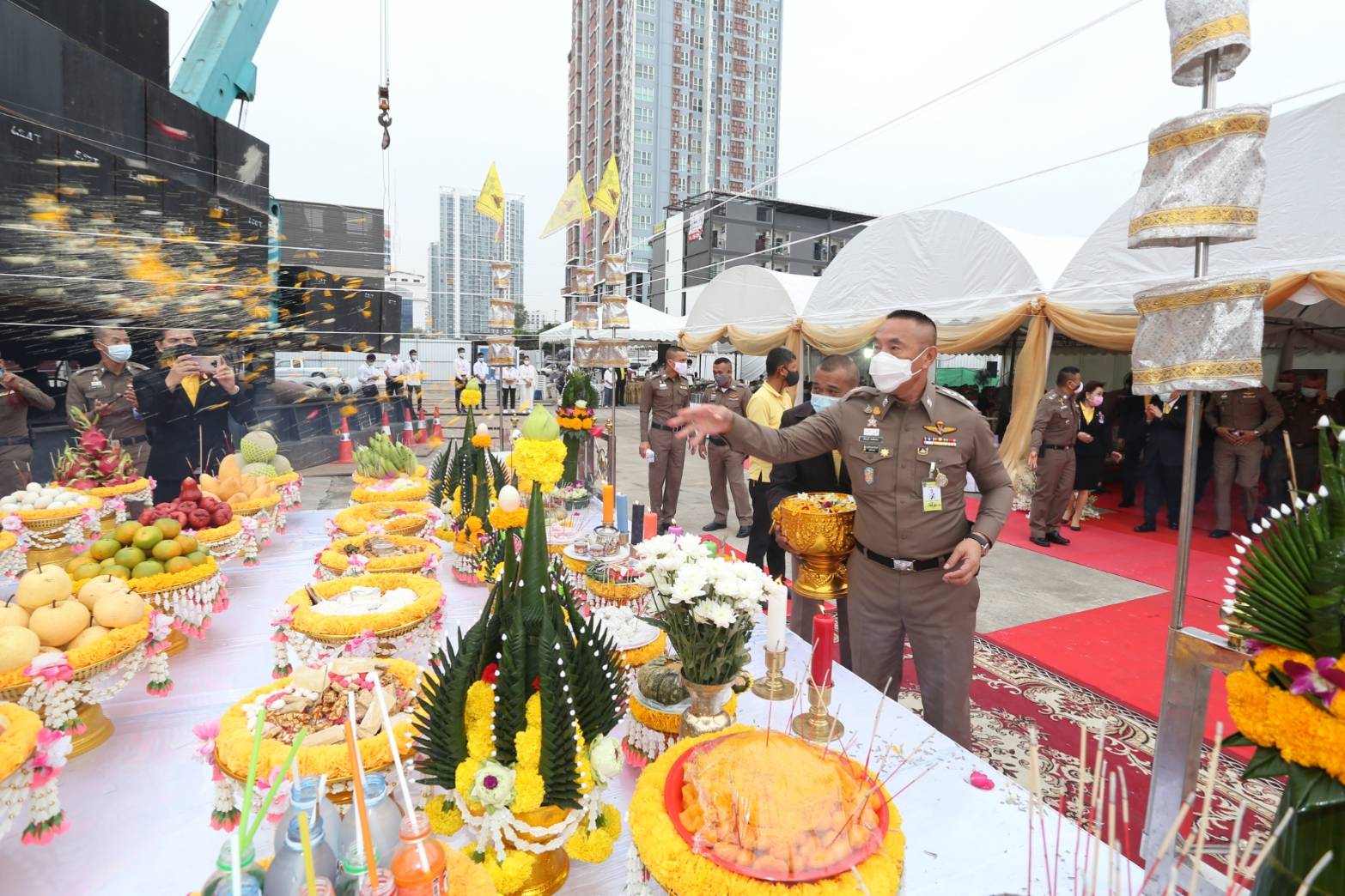 โดยได้รับความเมตตาจากเจ้าพระคุณ สมเด็จพระมหารัชมงคลมนี (ธงชัย ธมฺมธโช) เจ้าคณะใหญ่หนกลาง กรรมการมหาเกระสมาคม วัดไตรมิตรวิทยาราม กรุงเทพมหานคร ประธานพิธีฝ่ายสงฆ์ ทำพิธีบวงสรวง โดยพระครูภาวณาโสภณ วัดป่าธรรมโสภณ จังหวัดลพบุรี ประกอบพิธี จากนั้นประธานในพิธี และรองประธาน และผู้บังคับบัญชา ร่วมโปรยข้าวตอกดอกไม้ พระะสงฆ์จำนวนรวม 9 รูป สวดเจริญพระพุทธมนต์ เพื่อความเป็นศิริมงคลแก่ผู้ร่วมพิธี โดย พล.ต.ท.ภัคพงศ์ พงษ์เภตรา ผู้บัญชาการตำรวจ นครบาล ประธานในพิธีทำพิธีวางศิลาฤกษ์ พร้อมผลไม้มงคล 9 ชนิด วางแผ่นอิฐ /แผ่นเงินทองนาค,วางใบไม้มงคล,ฉาบปูนบนแผ่นอิฐ,วางแผ่นศิลาฤกษ์ /วางทับทิม จากนั้นสมเด็จพระมหารัชมงคลมุนี (ธงชัย ธมมธโช) ประธานในพิธีฝ่ายสงฆ์พรมน้ำมนต์ และโปรยดอกไม้ที่เข็มเอก ตอกเข็มเอกเป็นปฐมฤกษ์ เป็นเสร็จพิธี