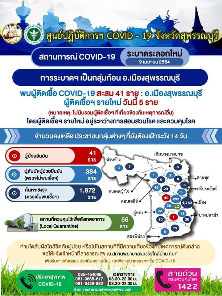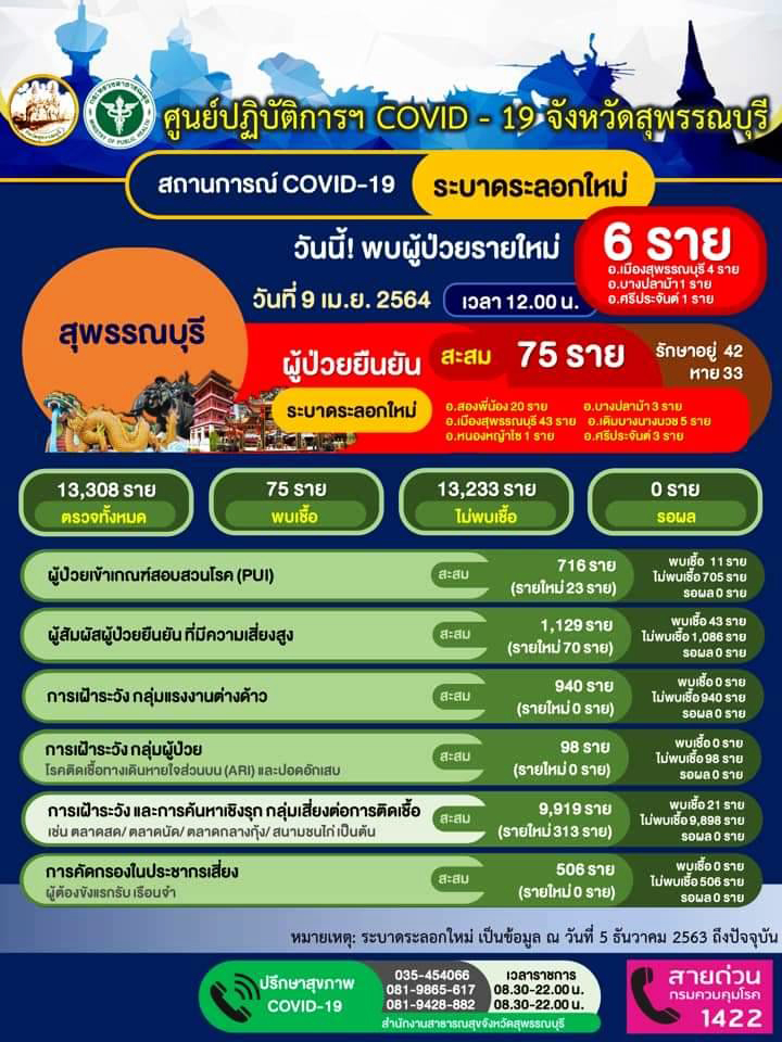 สำหรับสถานการณ์แพร่ระบาดของโควิด19ที่สุพรรณบุรี ยังมีต่อเนื่องล่าสุดวันที่ 9 เมษายน สำนักงานสาธารณสุขจังหวัดสุพรรณบุรี ได้เปิดว่าพบผู้ติดเชื้อเพิ่มอีกจำนวน 5 รายประกอบด้วย ชายไทยอายุ 37 ปีชาวอำเภอเมืองสุพรรณบุรี พนักงานประจำรถขยะเทศบาลตำบลท่าระหัด ชายไทยอายุ 37 ปีชาวตำบลรั้วใหญ่ อำเภอเมืองสุพรรณบุรี ชายไทยอายุ 30 ปีพนักงานประจำรถขยะเทศบาลตำบลท่าระหัด เด็กหญิงชาวไทยอายุ 12 ปีบ้านอยู่ ต.ท่าระหัด เด็กหญิงชาวไทยอายุ 13 ปีบ้านอยู่ ต.ท่าระหัด