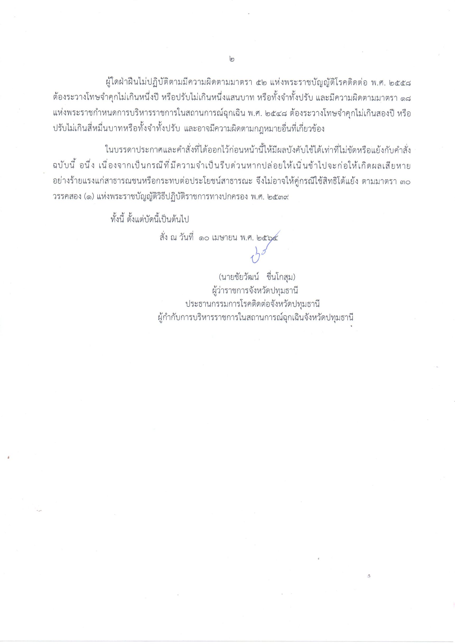 ตามที่จังหวัดปทุมธานี ได้มีคำสั่งฯที่ 1958/2564ลงวันที่ 23 กุมภาพันธ์ 2564และคำสั่ง ๆ ที่ 3089/2564 ลงวันที่ 26 มีนาคม 2564 ได้กำหนดมาตรการป้องกันและควบคุมการแพร่ระบาดของโรคติดเชื้อไวรัสโคโรนา 2019 (โควิด – 19) ให้ผู้เกี่ยวข้องถือปฏิบัติในการป้องกัน ระงับยับยั้ง และลดโอกาสการระบาดของโรคในสถานที่ต่าง ๆ ไปแล้ว นั้นโดยที่สถานการณ์การระบาดของโรคติดเชื้อไวรัสโคโรนา 2019 ในช่วงเวลาที่ผ่านมา พบจำนวนผู้ติดเชื้อรายใหม่เพิ่มขึ้นอย่างมีนัยสำคัญ และผู้ติดเชื้อได้กระจายตัวออกไปในหลายพื้นที่อย่างรวดเร็ว จากการติดตามและสอบสวนโรคของเจ้าหน้าที่ฝ่ายสาธารณสุขพบว่า การแพร่ระบาดในลักษณะกลุ่มก้อนนี้ ผู้ติดเชื้อหลายรายมีกรณีเชื่อมโยงกับการเข้าใช้บริการของสถานบันเทิงหรือสถานบริการประเภทต่าง ๆ โดยที่มิได้แสดงอาการของโรคและได้แพร่โรคออกไปยังผู้สัมผัสใกล้ชิด ซึ่งมีข้อมูลว่าเป็นเชื้อโรคสายพันธุ์ที่สามารถระบาดได้รวดเร็วกว่าสายพันธุ์ปกติประกอบกับการเริ่มเข้าสู่ช่วงเทศกาลวันหยุดที่เป็นปัจจัยเสี่ยงเพิ่มขึ้น หากไม่ดำเนินการเข้าควบคุมก็อาจเกิดการรวมกลุ่มของบุคคลในสถานที่ดังกล่าว โดยละเลยไม่ปฏิบัติตามมาตรการป้องกันโรคตามที่ทางราชการกำหนดจึงมีความจำเป็นต้องบังคับใช้มาตรการที่เข้มงวดและเร่งด่วนสำหรับสถานที่เสี่ยงต่อการแพโรคนี้เพื่อป้องกันและระงับยับยั้งการระบาดของโรคมิให้แพร่ระบาดออกไปในวงกว้าง อาศัยอำนาจตามความในมาตรา 34 และมาตรา 35 แห่งพระราชบัญญัติโรคติดต่อ พ.ศ. 2558ประกอบกับข้อกำหนดออกตามความในมาตรา 9 แห่งพระราชกำหนดการบริหารราชการในสถานการณ์ฉุกเฉิน พ.ศ. 2548 (ฉบับที่ 1) ลงวันที่ 25 มีนาคม 2563 และข้อกำหนด ฯ(ฉบับที่ 19) ลงวันที่ 3 เมษายน 2564 ผู้ว่าราชกรจังหวัดปทุมธานี โดยความเห็นชอบของคณะกรรมการโรคติดต่อจังหวัดปทุมธานี ตามมติที่ประชุม ครั้งที่ 20/2564 เมื่อวันที่ 10 เมษายน 2564 จึงให้ปิดสถานที่เป็นการชั่วคราวในพื้นที่จังหวัดปทุมธานี