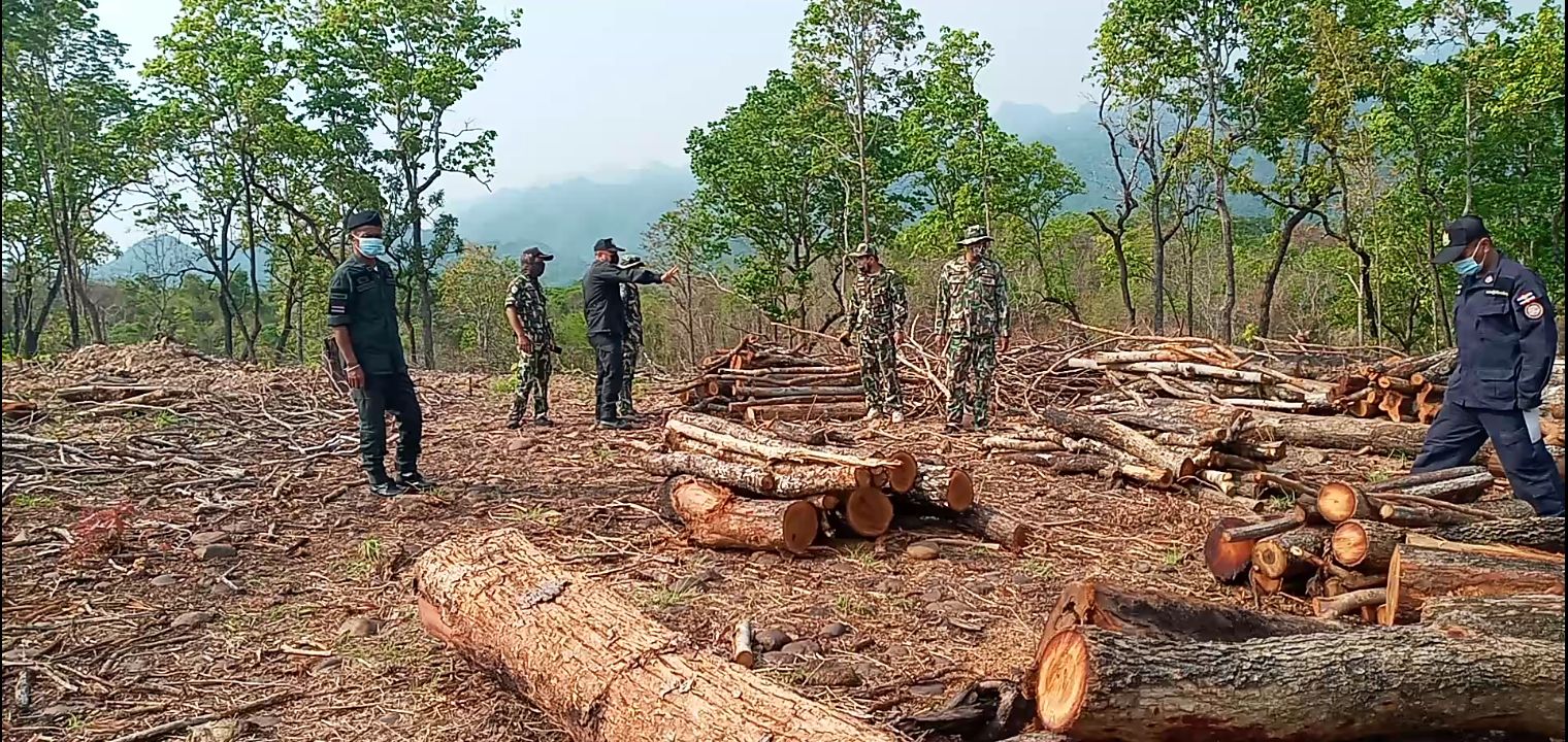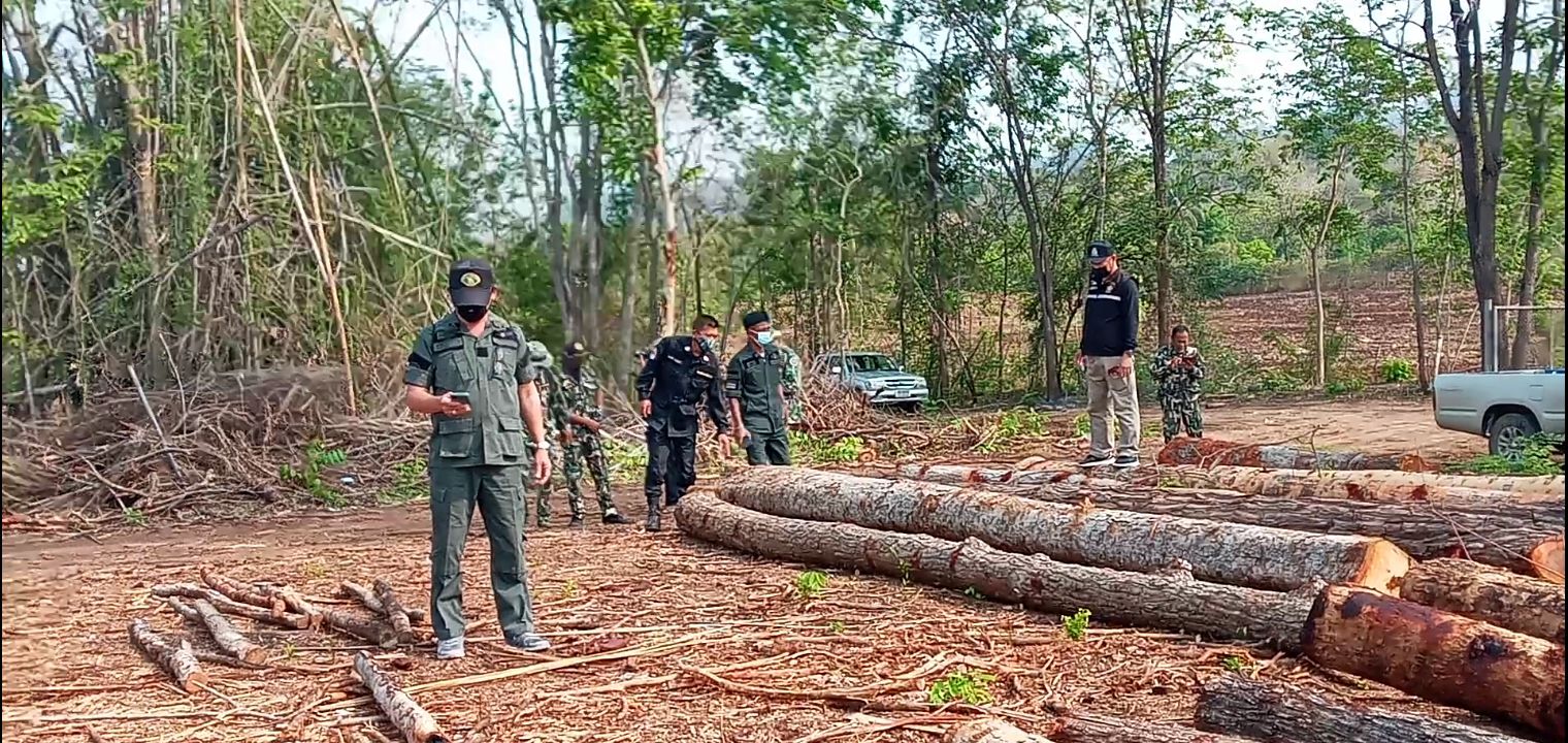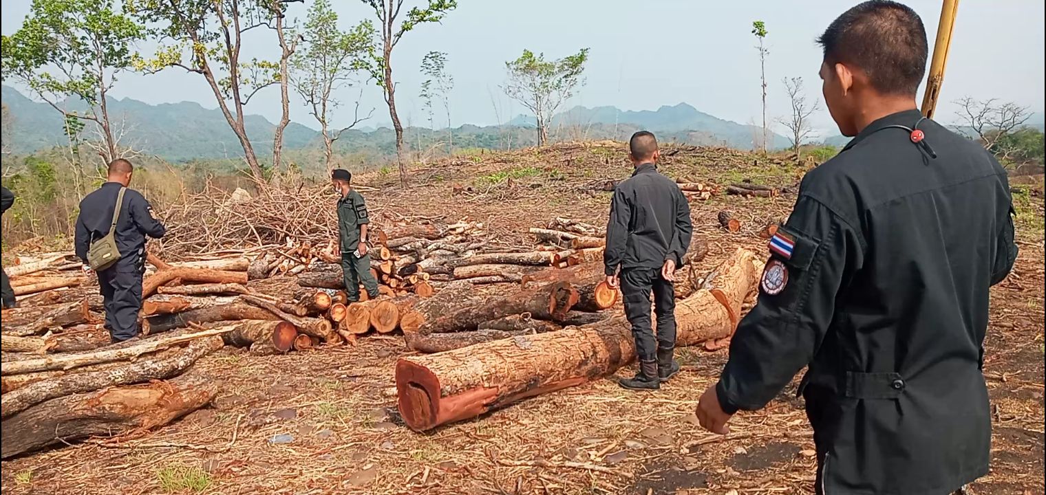 กาญจนบุรี จนท.ยึดไม้หวงห้ามที่ลักลอบตัดในพื้นที่ สปก.กว่า 400 ท่อนในพื้นที่ป่าไทรโยค