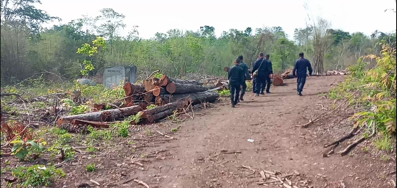 จึงได้สนธิกำลังเข้าตรวจสอบบริเวณที่เกิดเหตุ ห่างจากถนนสาย 323 ไทรโยค-ทองผาภูมิ 300 เมตรเป็นพื้นที่เนินเขา พบมีการตัดโค่นต้นไม้ใหญ่ และแผ้วถางเป็นบริเวณกว้าง โดยรอบพื้นที่เป็นเนินเขา และมีการตัดเป็นถนนรอบเขา พรัอมมีเพิงพักแรมของคนงานตัดฟันต้นไม้ แต่ไม่พบบุคคลใดในพื้นที่เกิดเหตุ ตรวจสอบรอบเนินเขามีพื้นที่กว่า 40 ไร่ พบไม้หวงห้ามหลายชนิด ได้ถูกตัดโค่นมีทั้งไม้แดง ไม้ประดู่ ไม้เต็ง ไม้รัง ไม้กะบากและอีกชนิด หลายขนาด ถูกตัดทอนเป็นท่อนๆ ยาวตั้งแต่ 1เมตรถึง 6 เมตร กว่า 400 ท่อน กองเกลื่อนไปทั่วสองข้างทางที่เป็นถนนรอบเนินเขา ยาวเป็นระยะทางกว่า1กม.