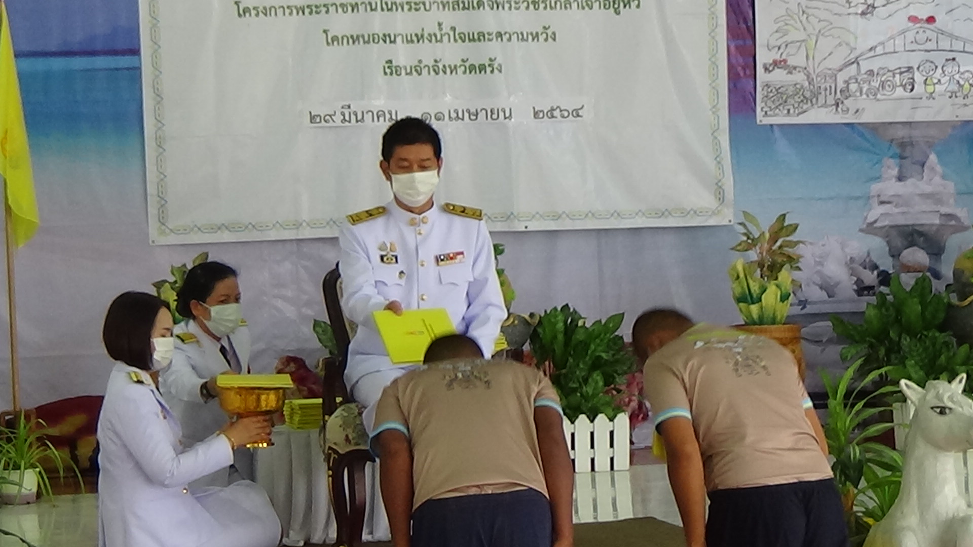 (12 เม.ย.2564) ที่เรือนจำจังหวัดตรัง พระบาทสมเด็จพระเจ้าอยู่หัว ทรงพระกรุณาโปรดเกล้าโปรดกระหม่อมให้ นายขจรศักดิ์ เจริญโสภา ผู้ว่าราชการจังหวัดตรัง เป็นผู้แทนพระองค์ในพิธีปิดการฝึกอบรมในโครงการพระราชทาน “โคก หนอง นา แห่งน้ำจะและความหวัง รุ่นพิเศษ โดยมี นายภักดี แก้วเนียม ผู้บัญชาการเรือนจำจังหวัดตรัง กล่าวรายงาน