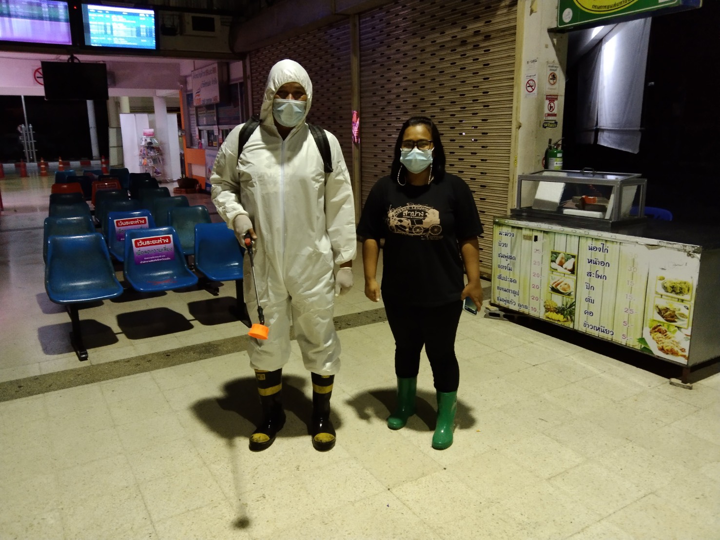นางสาวพิณทิพย์ ศรีสมัย นักวิชาการสิ่งแวดล้อมชำนาญการ รักษาการในตำแหน่งหัวหน้าฝ่ายสาธารณภัยและสิ่งแวดล้อม องค์การบริหารส่วนจังหวัดตรัง นำเจ้าหน้าที่ฝ่ายสาธารณภัยและสิ่งแวดล้อม องค์การบริหารส่วนจังหวัดตรัง ฉีดพ่นยาฆ่าเชื้อไวรัสโคโรนา 2019 (โควิด-19) บริเวณสถานีขนส่งผู้โดยสารตรังทั่วบริเวณอาคาร นอกอาคาร ศาลารถจักรยานยนต์รับจ้าง เพื่อเป็นการฆ่าเชื้อโรค ป้องกันโควิด-19 และสร้างความมั่นใจให้กับผู้ใช้บริการ หลังจากที่มีหญิงอายุ 22 ปี ที่ติดเชื้อโควิด-19 ได้เดินทางด้วยรถทัวร์โดยสารจาก กทม. มาลงที่สถานีขนส่งแห่งนี้ เมื่อวันที่ 10 เมษายน 2564 ที่ผ่านมา