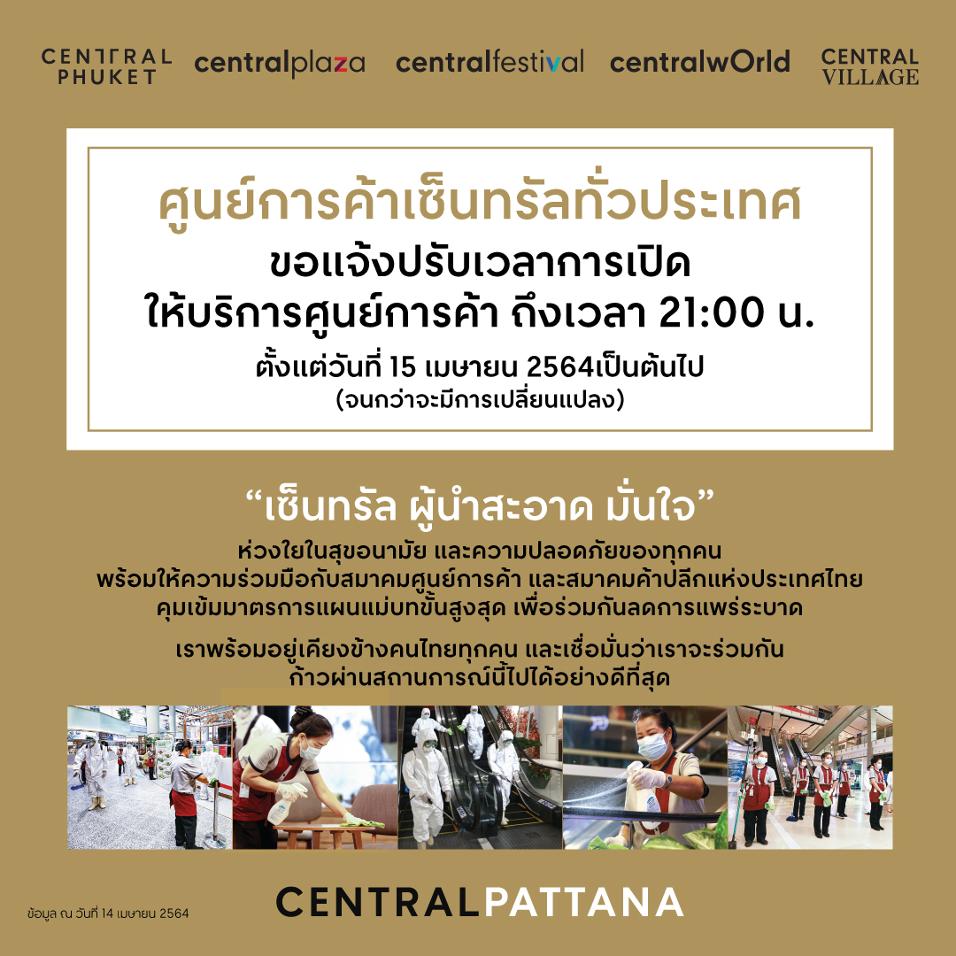บริษัท เซ็นทรัลพัฒนา จำกัด (มหาชน) ผู้บริหารศูนย์การค้าเซ็นทรัลเวิลด์, เซ็นทรัลพลาซา, เซ็นทรัลเฟสติวัล, เซ็นทรัล ภูเก็ต และ เซ็นทรัล วิลเลจ ลักชูรี่เอาท์เล็ตแห่งแรกของไทย ประกาศปรับเวลาเปิดให้บริการ ถึงเวลา 21.00 น. ตั้งแต่วันที่ 15 เมษายน 2564 เป็นต้นไป (จนกว่าจะมีการเปลี่ยนแปลง) พร้อมให้ความร่วมมืออย่างเต็มที่กับ มาตรการเข้มข้นในการลดการแพร่ระบาดของโควิด-19 ตามประกาศของสมาคมศูนย์การค้า และสมาคมค้าปลีกแห่งประเทศไทย