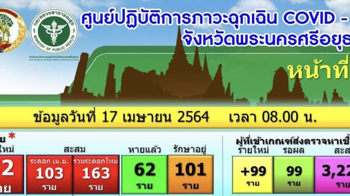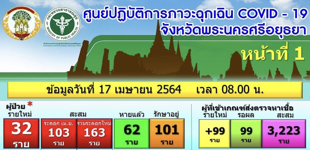 วันที่ 17 เมษายน 64 นายภานุ แย้มศรี ผู้ว่าราชการ จ.พระนครศรีอยุธยา เปิดเผยว่า ในวันนี้ตัวเลขอย่างเป็นทางการ สำหรับยอดผู้ติดเชื้อโควิดรายใหม่ของจังหวัด มีจำนวน 32 คน ทำให้ยอดสะสมของผู้ติดเชื้อระลอกที่ 2 มีสูงอยู่ที่ 163 คน และหากคิดเฉพาะเดือนเมษายน จะมีจำนวนผู้ติดเชื้อสะสมในเดือนเมษายนนี้ถึง 103 คนแล้ว โดยในจำนวนผู้ติดเชื้อสะสมทั้งหมด 163 คน แยกเป็นรักษาตัวจนหายขาดแล้ว 62 คน และต้องรักษาตัวในโรงพยาบาลอีก 101 คน และยังมีกลุ่มคนที่สุ่มเสียงสูงว่าจะติดเชื้อ ซึ่งได้มีการส่งตัวไปตรวจหาเชื้อแล้ว อยู่ระหว่างรอผลอย่างเป็นทางการอีก 99 คนสำหรับผู้ติดเชื้อรายใหม่จำนวนมากในวันนี้ ส่วนใหญ่พักอาศัยอยู่ในเขต อ.พระนครศรีอยุธยา ,อ.อุทัย และ อ.บางปะอิน โดยจำนวนผู้ติดเชื้อที่พบมากในวันนี้ เกิดจากการเข้าไปตรวจสอบเชิงรุก และให้ทุกคนที่สุ่มเสี่ยงสูงว่าจะติดเชื้อได้เข้ามารับการตรวจหาเชื้อได้ฟรี