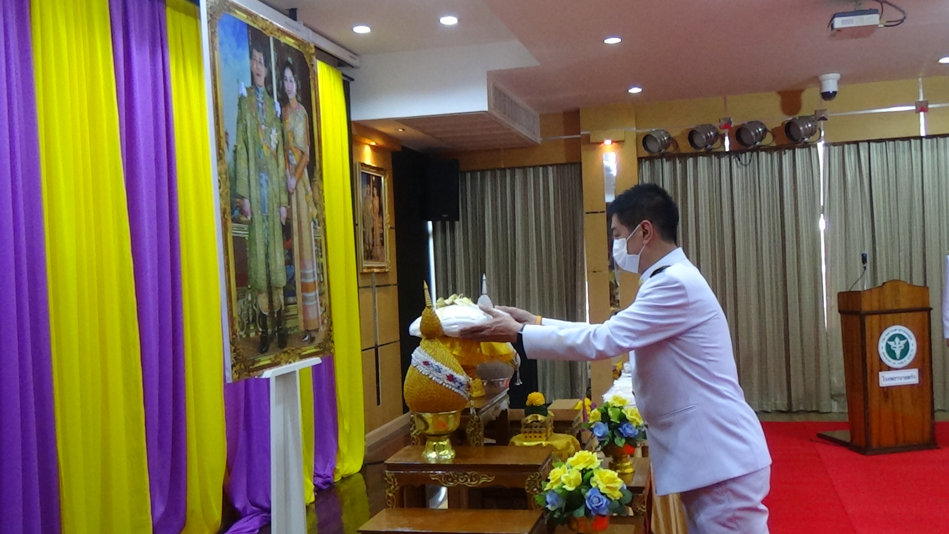 ที่ห้องประชุมราชพฤกษ์ อาคารอำนวยการ ชั้น 2 โรงพยาบาลตรัง นายขจรศักดิ์ เจริญโสภา ผู้ว่าราชการจังหวัดตรัง เป็นประธานในพิธีรับมอบอุปกรณ์ทางการแพทย์พระราชทานจากพระบาทสมเด็จพระเจ้าอยู่หัว และสมเด็จพระนางเจ้าฯ พระบรมราชินี โดยผู้ว่าราชการจังหวัดตรังเปิดกรวยดอกไม้ถวายสักการะต่อหน้าพระบรมฉายาลักษณ์ พระบาทสมเด็จพระเจ้าอยู่หัวและสมเด็จพระนางเจ้าฯ พระบรมราชินี เพื่อรับมอบเครื่องมือแพทย์พระราชทาน และกล่าวสำนึกในพระมหากรุณาธิคุณ พระบาทสมเด็จพระเจ้าอยู่หัว ทรงพระกรุณาโปรดเกล้าโปรดกระหม่อมพระราชทานเครื่องมือแพทย์ เพื่อรับมือสถานการณ์โควิด -19 ให้แก่โรงพยาบาลตรัง บรรเทาปัญหาการขาดแคลนอุปกรณ์ทางการแพทย์ เพิ่มศักยภาพและประสิทธิภาพในการดูแลรักษาผู้ป่วยโรคติดเชื้อไวรัสโคโรนา 2019 (โควิด-19) โดยมี นายแพทย์สมบัติ สธนเสาวภาคย์ ผู้อำนวยการโรงพยาบาลตรัง พร้อมด้วยคณะผู้บริหารและเจ้าหน้าที่โรงพยาบาลตรัง ร่วมพิธี