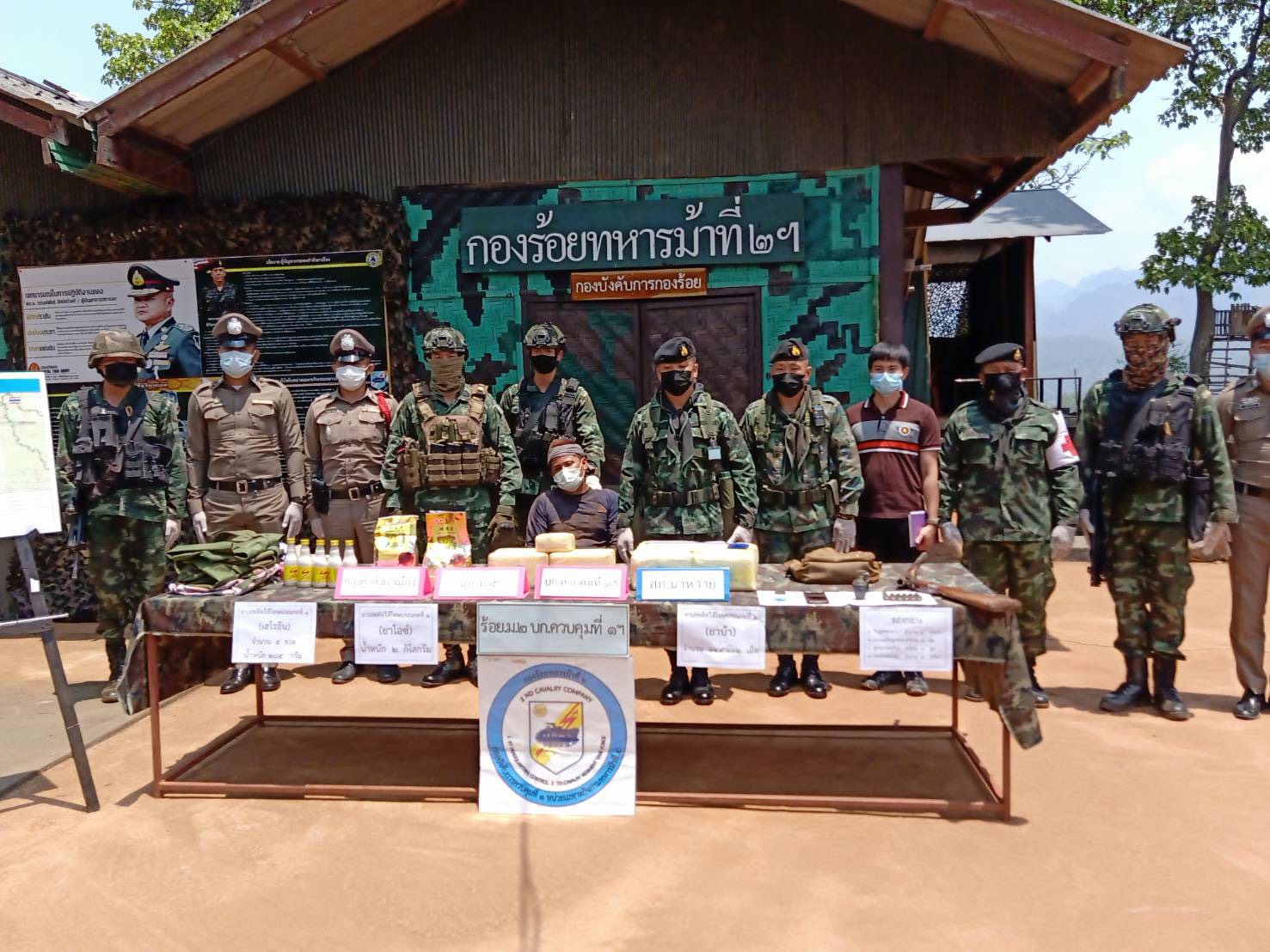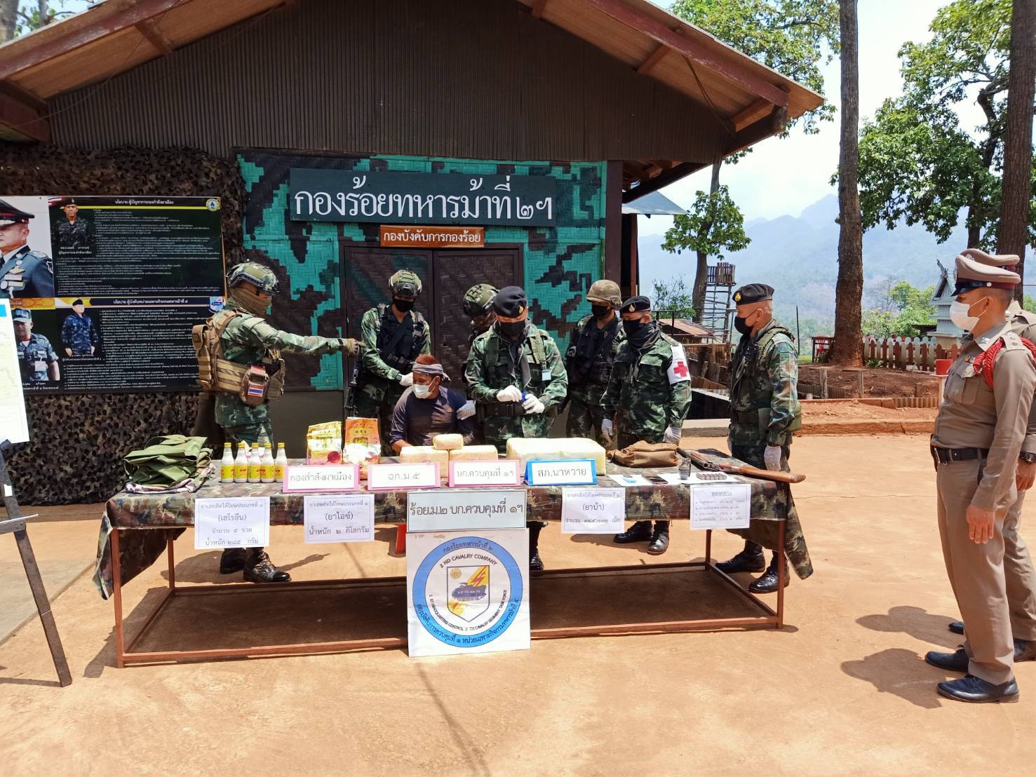 เมื่อกลางดึกของวันที่ 19 เมษายน 2564 กองร้อยทหารม้าที่ 2 หน่วยเฉพาะกิจกรมทหารม้าที่ 5 กองกำลังผาเมือง จัดกำลัง ปฏิบัติภารกิจลาดตระเวนเฝ้าตรวจ ในพื้นที่ ตำบลเมืองนะ อำเภอเชียงดาว จังหวัดเชียงใหม่ ตรวจพบกลุ่มบุคคลต้องสงสัยสะพายเป้สีเขียว ประมาณ 2 – 3 คน เดินเข้ามาตามเส้นทางในภูมิประเทศ เจ้าหน้าที่จึงแจ้งเตือนให้หยุด เพื่อขอทำการตรวจค้น แต่กลุ่มบุคคลดังกล่าวได้ใช้อาวุธปืนไม่ทราบชนิดยิงใส่เจ้าหน้าที่ จึงเกิดการปะทะกัน ประมาณ 3 นาที หน่วยจึงได้จัดกำลังควบคุมพื้นที่เกิดเหตุเพิ่มเติม จนสามารถจับกุมผู้ต้องหาได้ จำนวน 1 คน จากการตรวจสอบพื้นที่เกิดเหตุ ตรวจพบเป้สะพายหลังสีเขียว จำนวน 2 เป้ ภายในบรรจุยาเสพติดให้โทษประเภทที่ 1 (ยาบ้า) จำนวน 144,132 เม็ด, ยาไอซ์ น้ำหนัก 1.95 กิโลกรัม, เฮโรอีน 5 ขวดสปอนเซอร์ น้ำหนัก 285 กรัม, อาวุธปืนลูกซองยาว 1 บอก พร้อมเครื่องกระสุน และระเบิดมือ 1 ลูก ปัจจุบันอยู่ระหว่างรวบรวม และจัดเก็บวัตถุพยานเพื่อขยายผลหาผู้กระทำความผิดเพิ่มเติม และนำตัวผู้ต้องหา พร้อมของกลางทั้งหมดส่งให้ สถานีตำรวจภูธรเชียงดาว ดำเนินคดีตามกฎหมายต่อไป