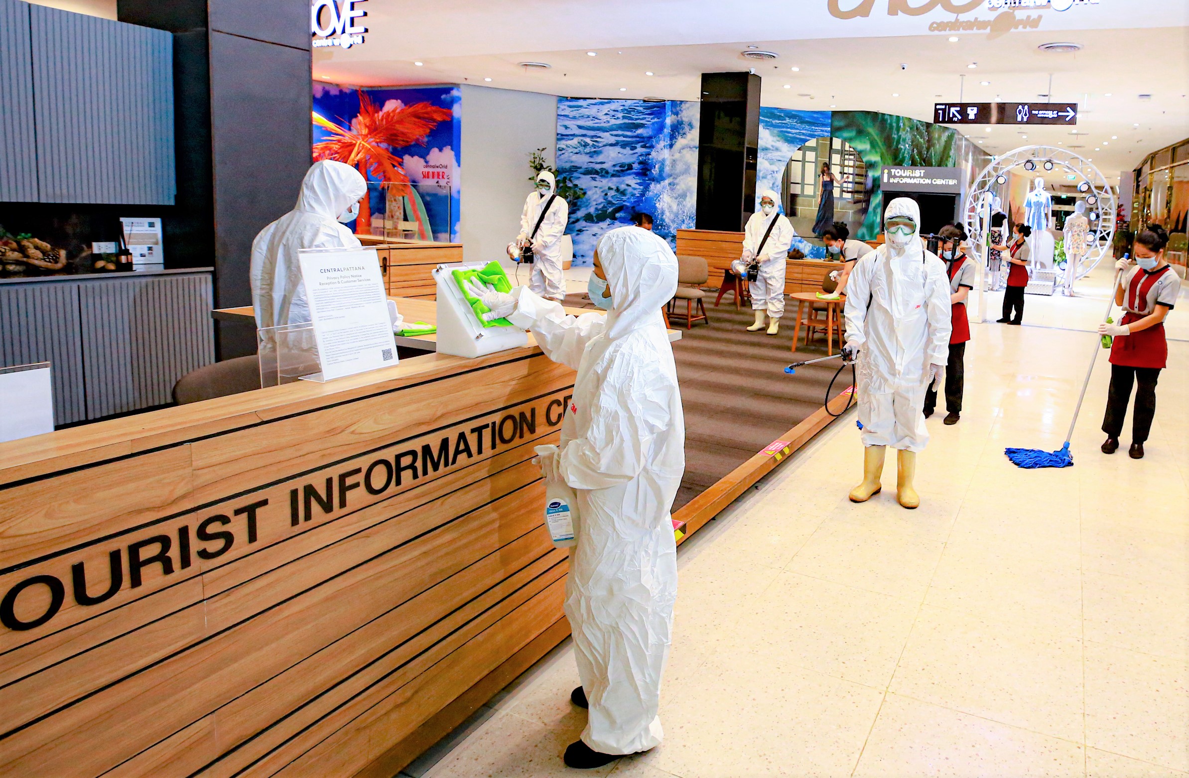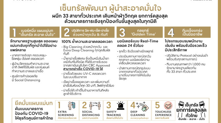 เซ็นทรัลพัฒนา ผู้นำสะอาด มั่นใจ ผนึก 33 สาขาทั่วประเทศ เดินหน้าฝ่าวิกฤต ยกการ์ดสูงสุดทั่วไทย ป้องกันเชิงรุกขั้นสูงสุดในทุกมิติ ผนึกพลังรวมกันใช้ชีวิตอย่างมีวินัย“เบอร์หนึ่ง” แผนแม่บท 5 แกนหลักที่ถูกนำไปใช้อย่างแพร่หลาย ด้วยมาตรการที่ครอบคลุม-ยืดหยุ่น-อัพเดทตลอดเวลา คุมเข้ม 100% Social distancing ทั่วพื้นที่ ปฏิบัติการเชิงรุกทุกวัน-ทันที ด้วยการทำ Big cleaning ล่วงหน้าทุกวัน และ Extra Deep Cleaning ฉีดพ่นทุกจุดสัมผัสทันที ด้วยน้ำยาฆ่าเชื้อพิเศษ ซึ่งเป็นหนึ่งในน้ำยาเคมีภัณฑ์ไม่กี่ชนิด ที่ได้รับการรับรองจากสถาบันระดับโลก CBC Approved และหน่วยงานคุ้มครองสิ่งแวดล้อม ของสหรัฐอเมริกา สามารถฆ่าเชื้อ COVID-19 ได้ พร้อมรับมือทุกสถานการณ์ – ด้วยกลยุทธ์ ‘Golden Time’ มอนิเตอร์ทุกความเคลื่อนไหวทุกสาขา แบบ real-time ตลอด 24 ชั่วโมง