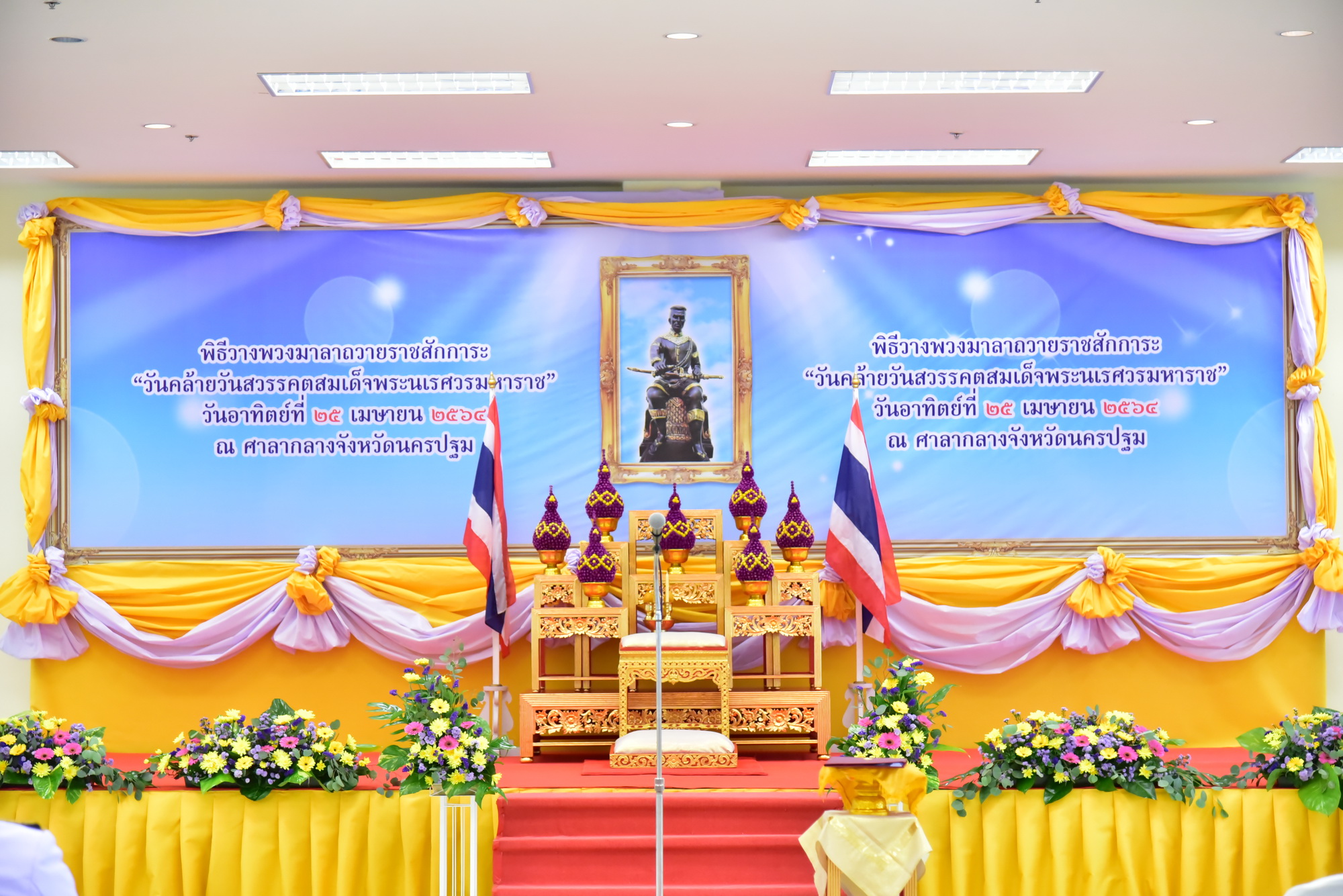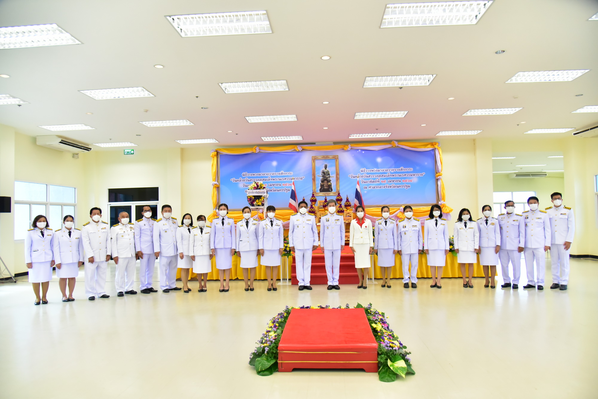 วันที่ 25 เมษายน 2564 ที่ห้องประชุมศาลากลางจังหวัดนครปฐม นายสุรศักดิ์ เจริญศิริโชติ ผู้ว่าราชการจังหวัดนครปฐม เป็นประธานพิธีวางพวงมาลา จุดธูป เทียน เครื่องทองน้อย ถวายราชสักการะ สมเด็จพระนเรศวรมหาราช เนื่องในวันคล้ายวันสวรรคต ครบรอบ 416 ปี โดยมีรองผู้ว่าราชการจังหวัด หัวหน้าส่วนราชการ ข้าราชการ ทหาร ตำรวจ ร่วมพิธีในครั้งนี้ เพื่อแสดงความจงรักภักดี ความกตัญญูกตเวทิตาคุณ และสำนึกในพระมหากรุณาธิคุณ ที่พระองค์ทรงมีคุณูปการต่อประเทศชาติ ทรงเป็นพระวีรมหากษัตริย์ประกอบพระวีรกรรมกอบกู้เอกราชของชาติ ทรงผดุงความเป็นไท ทรงปกป้องรักษาแผ่นดินแห่งสยามประเทศให้รอดพ้นภัยจากอริราชศัตรู ทรงประสาทประสิทธิ์อิสรภาพ เพื่อให้ปวงชนชาวไทยได้ดำรงชีวิตด้วยเกียรติยศศักดิ์ศรี และความร่มเย็นผาสุก
