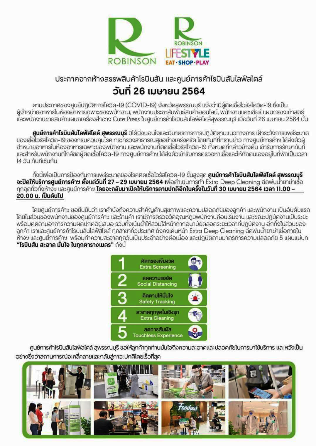 ล่าสุดช่วงค่ำวันที่ 26 เมษายน 2564 ห้างสรรพสินค้าโรบินสันและศูนย์การค้าโรบินสันไลฟ์สไตล์ สุพรรณบุรีได้ออกประกาศ โดยมีข้อความตามประกาศของศูนย์ปฏิบัติการโควิด-19จังหวัดสุพรรณบุรีแจ้งว่ามีผู้ติดเชื้อไวรัสโควิด-19ซึ่งเป็นผู้จำหน่ายอาหารในห้องอาหารเฉพาะของพนักงาน.พนักงานประชาสัมพันธ์สินค้าออนไลน์,พนักงานแคชเชียร์แผนกรองเท้าสตรี และพนักงานขายสินค้าแผนกเครื่องสำอางคิวเพลสในศูนย์การค้าโรบินสันเมื่อวันที่26เมษายน2564นั้น ศูนย์การค้าโรบินสันสุพรรณบุรีมิได้นิ่งนอนใจ และมีมาตรการปฏิบัติตามแนวทางการเฝ้าระวังการแพร่ระบาดของเชื้อไวรัสโควิด-19ของกรมควบคุมโรคกระทรวงสาธารณสุขอย่างเคร่งครัด ทั้งนี้เพื่อเป็นการป้องกันการแพร่ระบาดของโรคติดเชื้อไวรัสโควิด-19ขั้นสูงสุดศูนย์การค้าโรบินสันไลฟ์สไตล์ สุพรรณบุรี จะปิดให้บริการศูนย์การค้าฯตั้งแต่วันที่ 27-29 เมษายน2564 เพื่อดำเนินการExtra Deep Cleaning ฉีดพ่นน้ำยาฆ่าเชื้อทุกจุดทั่วทั้งห้างฯและศูนย์การค้าฯโดยจะกลับมาเปิดให้บริการตามปกติอีกครั้งในวันที่ 30 เมษายน2564เวลา 11.00-20.00 น.เป็นต้นไป