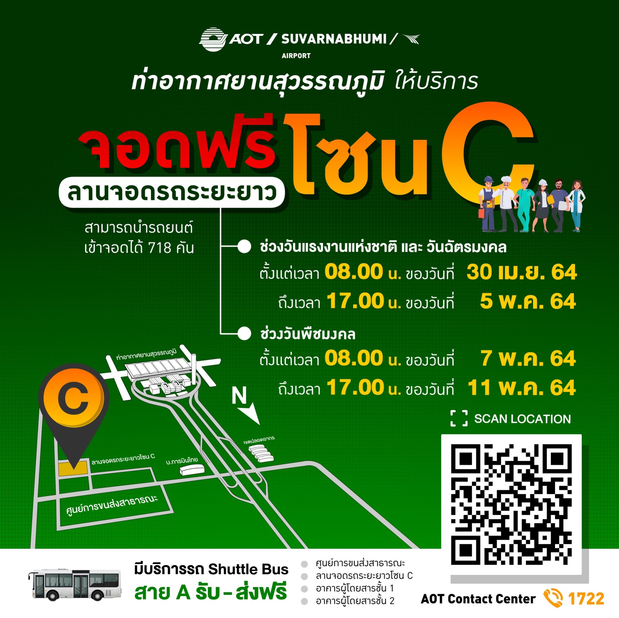 นาวาอากาศโทสุธีรวัฒน์ สุวรรณวัฒน์ ผู้อำนวยการท่าอากาศยานสุวรรณภูมิ บริษัท ท่าอากาศยานไทย จำกัด (มหาชน) (ทอท.) เปิดเผยว่า ท่าอากาศยานสุวรรณภูมิ (ทสภ.) จะยกเว้นอัตราค่าบริการจอดรถยนต์ที่ลานจอดรถยนต์ระยะยาว (Long Term Parking) โซน C ในช่วงวันหยุด วันเเรงงานและวันฉัตรมงคลระหว่างวันที่ 30 เม.ย. – 5 พ.ค. 2564 ตั้งแต่เวลา 08.00 ของวันที่ 30 เม.ย. 2564 ถึงเวลา 17.00 น. ของวันที่ 5 พ.ค. 2564 และช่วงวันหยุดวันพืชมงคล ตั้งแต่เวลา 08.00 ของวันที่ 7 พ.ค. 2564 ถึงเวลา 17.00 น. ของวันที่ 11 พ.ค. 2564 พร้อมจัดเตรียมรถ Shuttle Bus ให้บริการรับ – ส่งผู้โดยสารระหว่างลานจอดรถยนต์ระยะยาวและอาคารผู้โดยสาร เพื่ออำนวยความสะดวก ซึ่งสามารถจอดรถยนต์ได้จำนวน 718 คัน ทั้งนี้ ในช่วงดังกล่าว ทสภ. ได้จัดรถ Shuttle Bus สาย A วิ่งให้บริการรับ – ส่งผู้โดยสารทุกๆ 15 นาที ตลอด 24 ชั่วโมง โดยรถ Shuttle Bus สาย A จะวิ่งให้บริการรับ – ส่งผู้โดยสารจากศูนย์ขนส่งสาธารณะ (Bus Terminal) ไปยังลานจอดรถยนต์ระยะยาว โซน C เพื่อรับผู้โดยสารไปส่งยังอาคารผู้โดยสาร ชั้น 1 ประตู 3 และประตู 8 และวนขึ้นไปที่ชั้น 2 ประตู 5 ทั้งนี้ ผู้ใช้บริการรถ Shuttle Bus ไม่ต้องเสียค่าใช้จ่ายใดๆ ทั้งสิ้น
