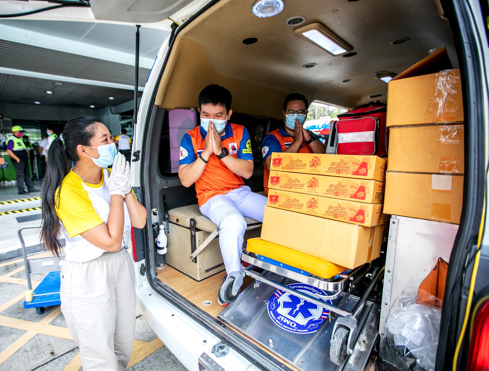สิงห์บุรี กาชาดมอบถุงยังชีพให้กับทีมกู้ภัยที่ร่วมปฏิบัติงานช่วยชาว กทม. รับ-ส่งผู้ป่วยโควิด