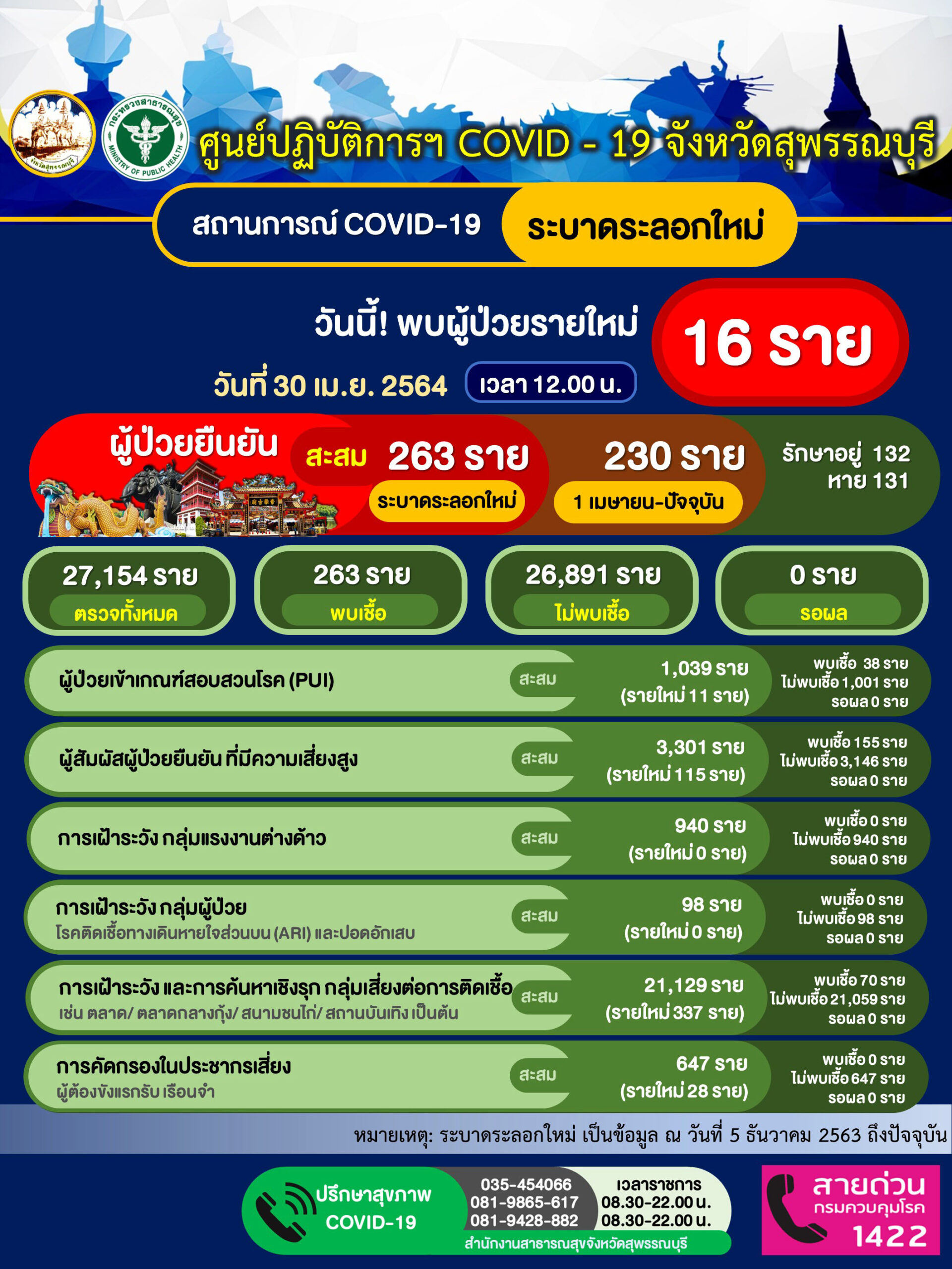 ทางด้านนายณัฐภัทร สุวรรณประทีป ผู้ว่าราชการจังหวัดสุพรรณบุรี เปิดเผยว่าสถานการณ์การแพร่ระบาดของเชื้อไวรัสโควิด 19 ทั้งประเทศมีผู้ติดเชื้ออย่างรวดเร็วในหลายพื้นที่และที่สุพรรณบุรียังมีผู้ติดเชื้อทุกวันเพราะฉะนั้นเราจึงต้องเตรียมพร้อมในเรื่องของโรงพยาบาลสนามและวันนี้พบผู้ติดเชื้ออีก 16 รายซึ่งถือว่าค่อนข้างสูงโดย10รายเป็นกลุ่มที่กักตัวอีก 3 รายเป็นพนักงานห้างโรบินสัน อีก3รายเป็นผู้ป่วยที่พบจากการค้นหาเชิงรุกถือว่าเราพบผู้ป่วยได้เร็วก็จะทำให้ผู้ที่รับเชื้อแคบลง ทำให้ขณะนี้สุพรรณบุรีมีผู้ป่วยสะสมระรอกใหม่ตั้งแต่วันที่ 1 เมษายน จำนวน 230รายรักษาตัวอยู่ที่โรงพยาบาล 132 รายรักษาหายกลับบ้านแล้ว 131 รายขณะที่เตียงมีการปรับปรุงรองรับผู้ป่วยจากโรงพยาบาลศูนย์และโรงพยาบาลชุมชนรวมแล้วจำนวน 182 เตียงวันนี้เรามีผู้ป่วยจำนวน 131 รายทำให้เหลือเตียงสำหรับผู้ป่วยโควิดอยู่อีก 51 เตียงซึ่งจำนวนเตียงนั้นจะไม่แน่นอนบางวันมีผู้ป่วยรักษาหายก็จะกลับบ้านถ้าพบผู้ป่วยใหม่ก็จะเข้ามาดังนั้นถ้าเราสามารถยับยั้งการแพร่ระบาดได้โรงพยาบาลสนามแห่งนี้ก็อาจจะไม่จำเป็นต้องใช้