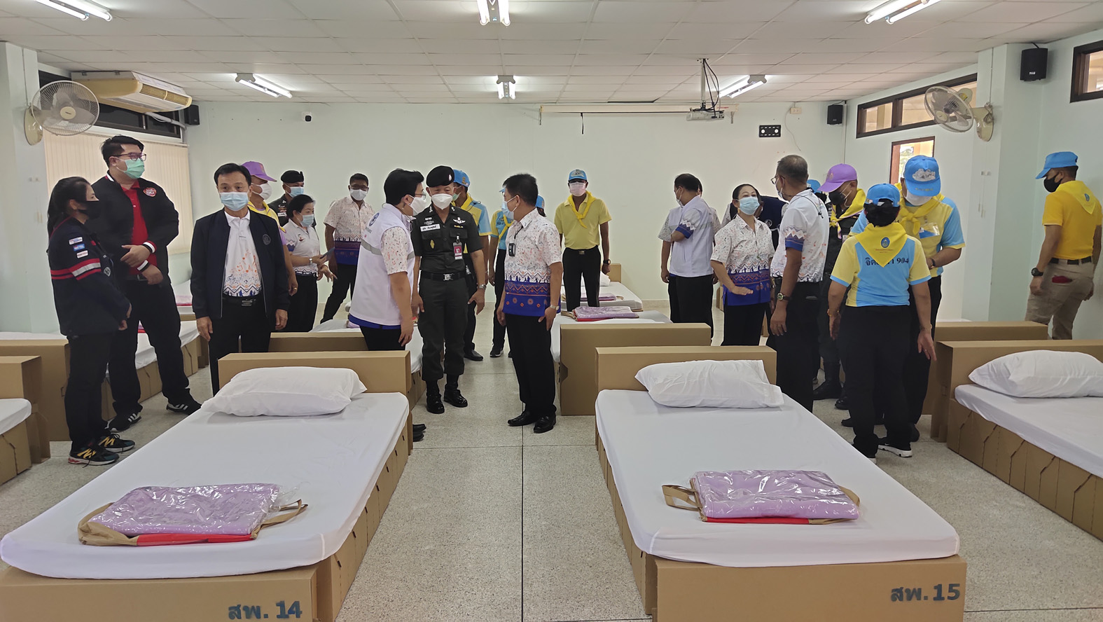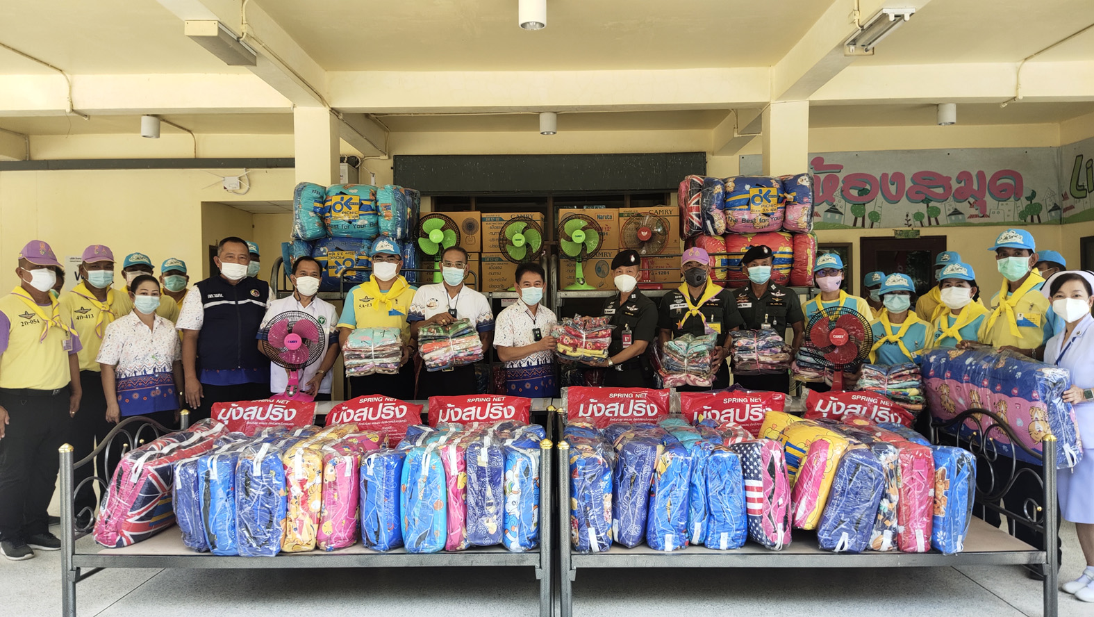 ที่จ.สุพรรณบุรี วันที่ 7 พ.ค.64 นายณัฐภัทร สุวรรณประทีป ผู้ว่าราชการจังหวัดสุพรรณบุรี พร้อมด้วย นายปรีชา ทองคำ และ นายชูชีพ พงษ์ไชย รองผู้วาราชการจังหวัดสุพรรณบุรี นายแพทย์วรงค์ รุ่งเรือง นายแพทย์สาธารณสุขจังหวัดสุพรรณบุรี นายแพทย์รัฐพล เวทสรณสุธี รองนายแพทย์สาธารณสุขจังหวัด ร่วมรับมอบเตียงนอนพร้อมที่นอนปิคนิค พัดลม และมุ้งสปริง จำนวน 100 ชุด และผ้าห่ม จำนวน 200 ผืน จาก พ.ต.อ.สุกิจ ก้องจตุศักดิ์ ผู้กำกับการตำรวจตระเวนชายแดนที่.13 จังหวัดกาญจนบุรี ในนามกองบัญชาการตำรวจตระเวนชายแดน โดยได้รับบริจาคจากเจ้าคณะอำเภอสวนผึ้ง จังหวัดราชบุรี เพื่อใช้ในการดำเนินงานของ รพ.สนามจังหวัดสุพรรณบุรี