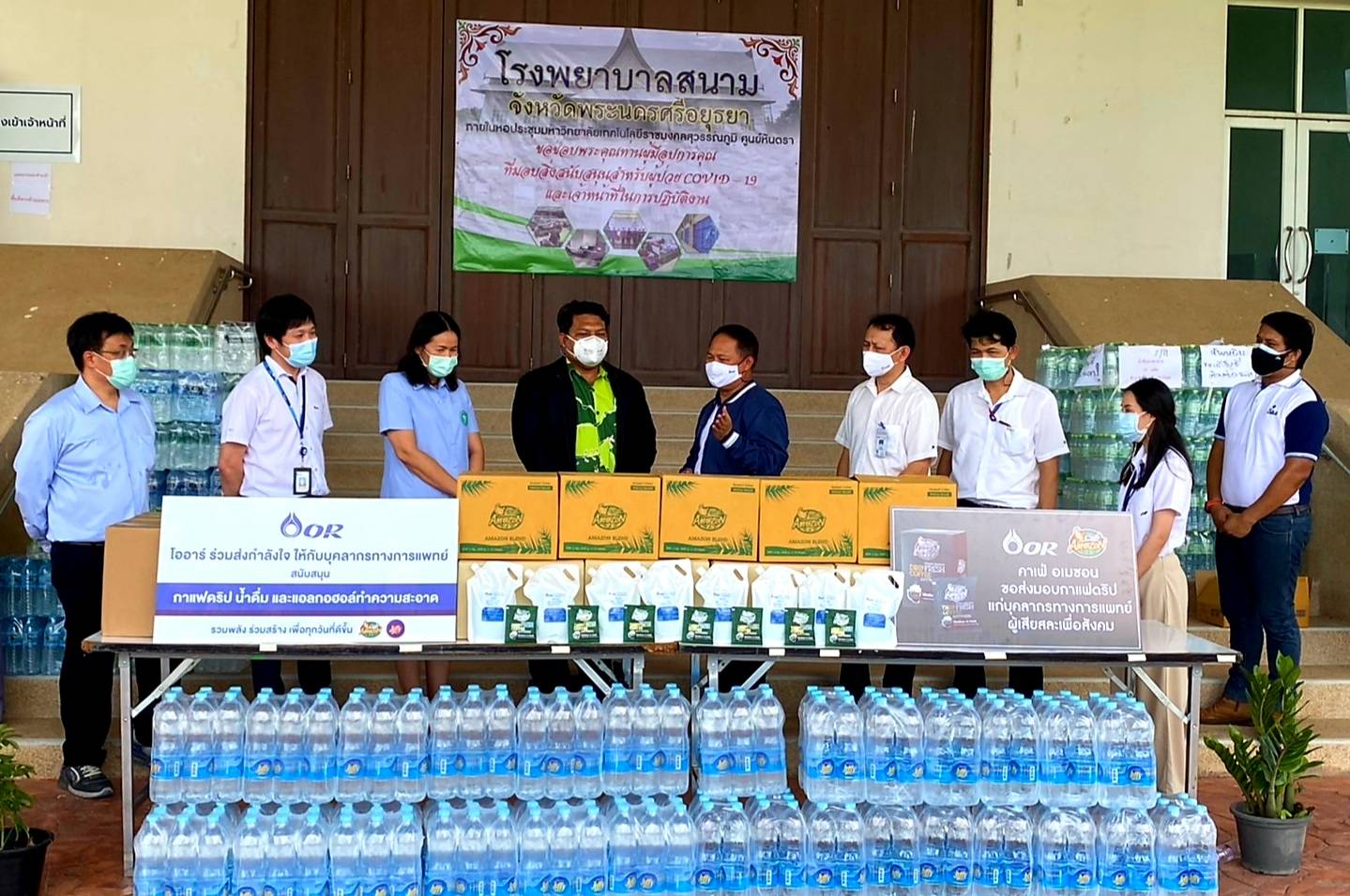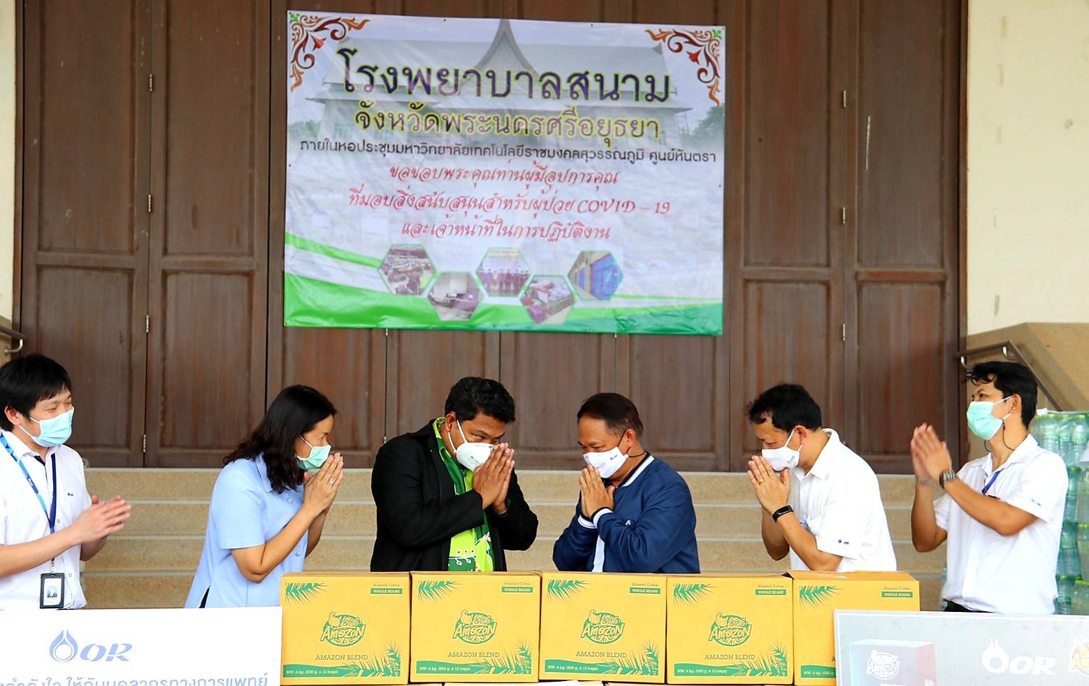 วันที่ 12 พฤษภาคม 2564 ฝ่ายสื่อสารองค์กร สถาบันพัฒนาศักยภาพธุรกิจน้ำมันและการค้าปลีก โรงคั่วกาแฟคาเฟ่อเมซอน บริษัท ปตท. น้ำมันและการค้าปลีก จำกัด (มหาชน) นำโดย นายอำนาจ รัตนจีนะ ผู้จัดการส่วนบริหารการฝึกอบรมและพัฒนา, นายเกรียงไกร กิตติวุฒิคุณ ผู้จัดการส่วนบริหารอาคารและซ่อมบำรุง และว่าที่ร้อยตรีรุจ ศรีจักรโคตร ผู้จัดการส่วนปฏิบัติการระบบท่อเขต 2 บริษัท ปตท. จำกัด (มหาชน) ร่วมมอบแอลกอฮอล์ 100 ลิตร น้ำดื่ม Jiffy 34 แพ็ค (แพ็คละ 6 ขวด) และกาแฟดริป คาเฟ่อเมซอน 500 ซอง แก่โรงพยาบาลสนาม มหาวิทยาลัยเทคโนโลยีราชมงคลสุวรรณภูมิ (หันตรา) จังหวัดพระนครศรีอยุธยา