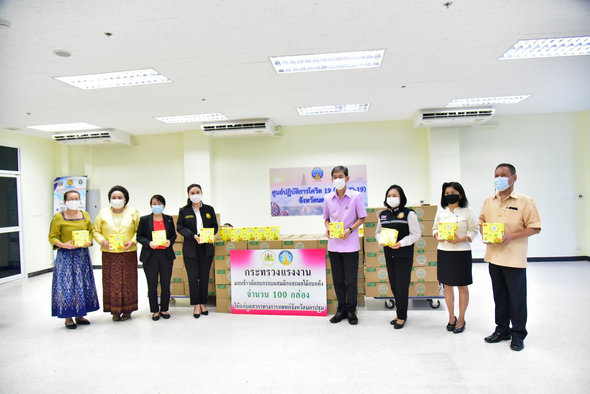 วันที่ 11 พฤษภาคม 2564 ที่ห้องแถลงข่าว ศูนย์ปฏิบัติการโควิด 19 ศาลากลางจังหวัดนครปฐม นางธิวัลรัตน์ อังกินันทน์ ที่ปรึกษารัฐมนตรีว่าการกระทรวงแรงงาน และนางเธียรรัตน์ นะวะมะวัฒน์ คณะที่ปรึกษารัฐมนตรีว่าการกระทรวงแรงงาน พร้อมคณะ มอบข้าวผัดอบกรอบผสมผักและผลไม้อบแห้ง จำนวน 100 กล่อง ให้กับนายสุรศักดิ์ เจริญศิริโชติ ผู้ว่าราชการจังหวัดนครปฐม เพื่อส่งมอบบุคลากรทางการแพทย์จังหวัดนครปฐม รวมทั้งสนับสนุนการปฏิบัติงานของเจ้าหน้าที่ทางการแพทย์ เจ้าหน้าที่สาธารณสุข หน่วยงานภาครัฐ ภาคเอกชน ที่ปฏิบัติภารกิจเกี่ยวกับการป้องกันและยับยั้งการแพร่ระบาดของโรคติดเชื้อไวรัสโคโรนา 2019