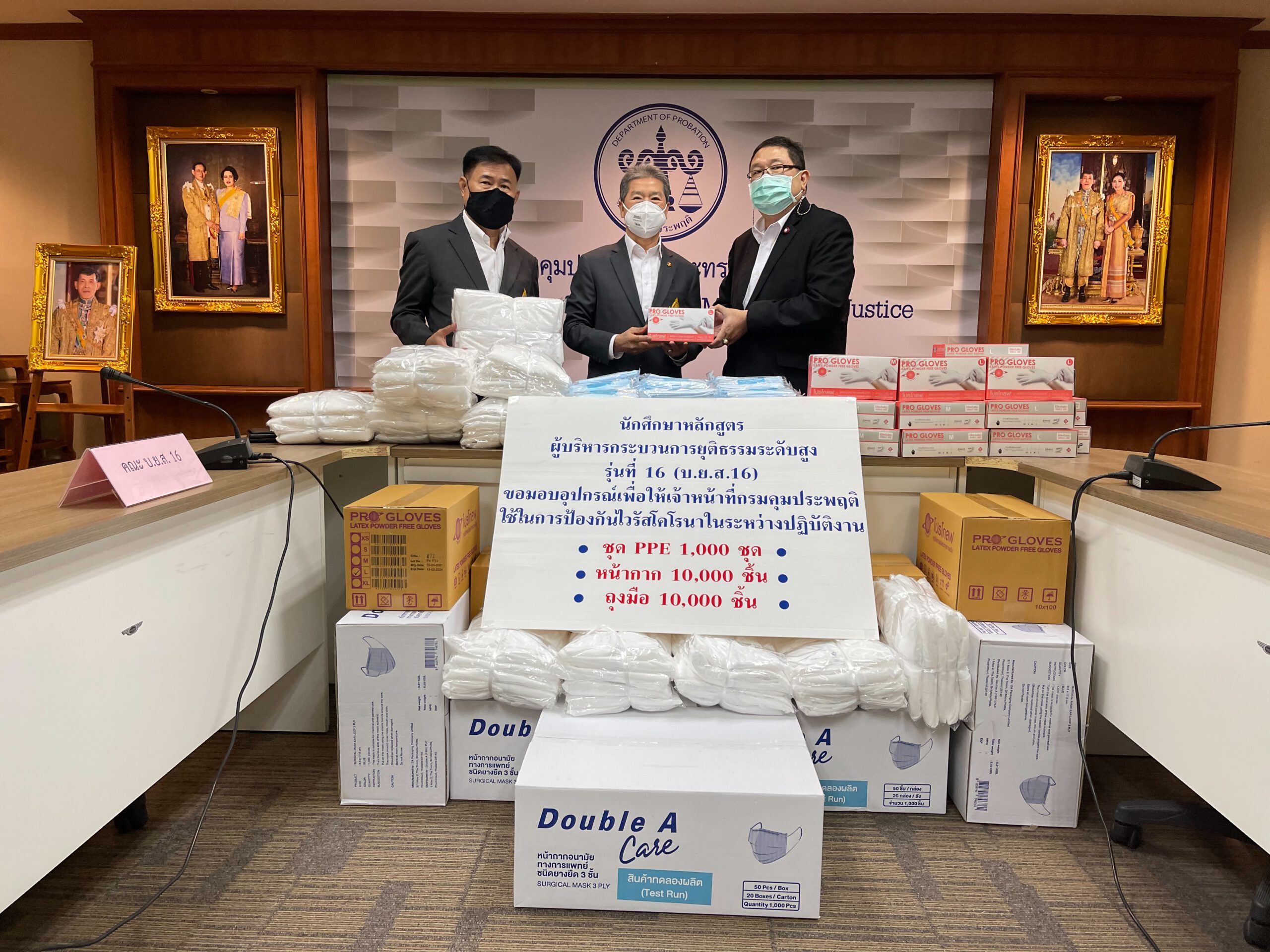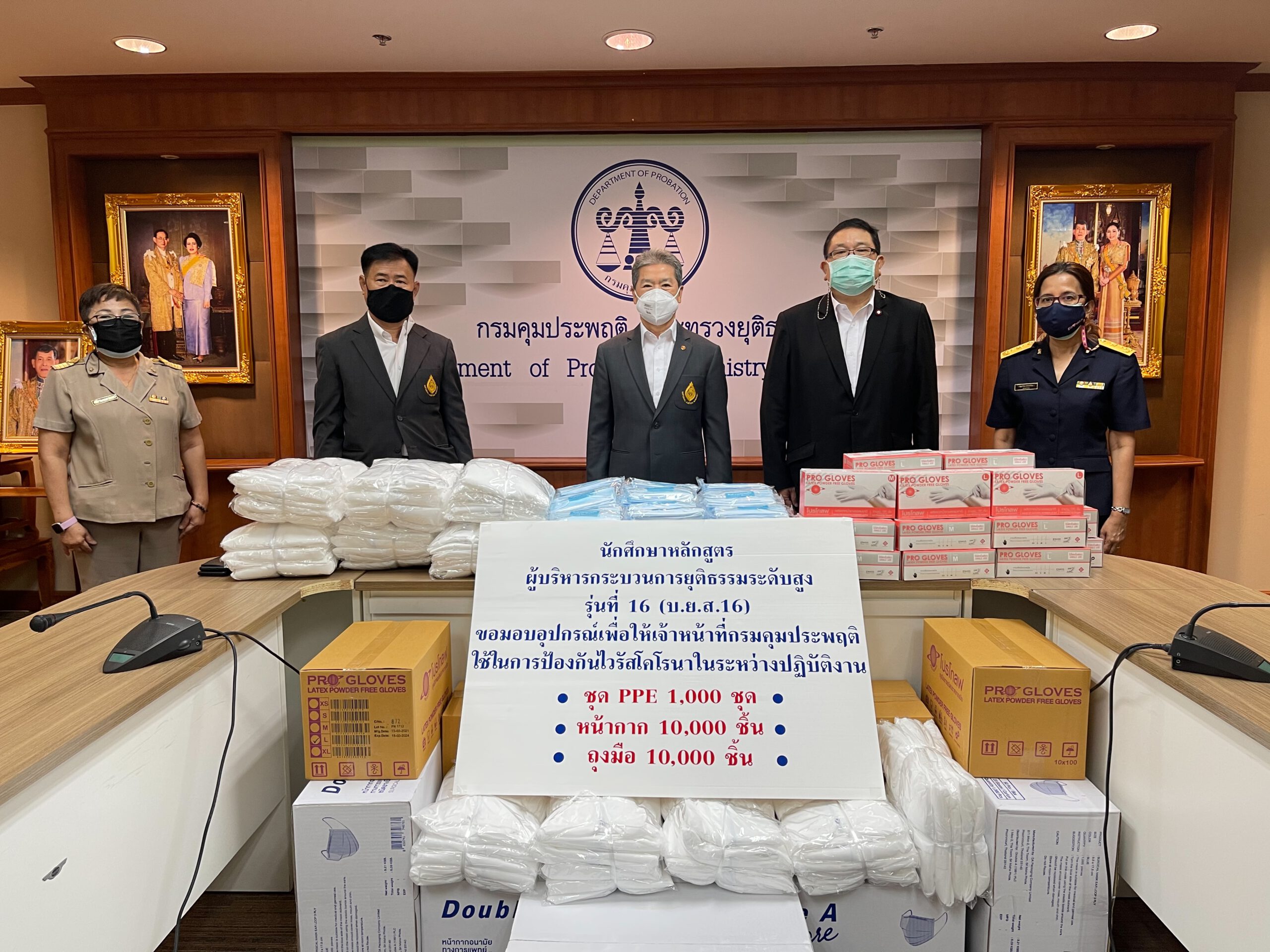 ที่กรมคุมประพฤติ ศูนย์ราชการเฉลิมพระเกียรติ 80พรรษา5ธันวาคม2550 ถ.แจ้งวัฒนะ กรุงเทพมหานคร นายวิตถวัลย์ สุนทรขจิต อธิบดีกรมคุมประพฤติ กระทรวงยุติธรรม ได้รับมอบอุปกรณ์ป้องกันไวรัสโคโรนาโควิด-19 ประกอบด้วยชุด PPE จำนวน 1,000ชุด หน้ากากอนามัย จำนวน 10,000 ชิ้น และถุงมือ จำนวน 10,000 ชิ้น จากนายฐนนท์ศรณ์ เลิศฤทธิ์ศิริกุล ประธานนักศึกษาหลักสูตรผู้บริหารกระบวนการยุติธรรมระดับสูง (บ.ย.ส.) รุ่นที่ 16 เพื่อมอบให้เจ้าหน้าที่กรมคุมประพฤติได้ใช้ในการปฏิบัติหน้าที่และป้องกันไวรัสโคโรนาโควิด-19 โดยนายฐนนท์ศรณ์ เลิศฤทธิ์ศิริกุล กล่าวว่าในสถานการณ์การแพร่ระบาดของไวรัสโคโรนาโควิด-19ที่มีความรุนแรงในขณะนี้ เจ้าหน้าที่ผู้ปฏิบัติงานต้องได้รับการดูแลอย่างใกล้ชิด คณะนักศึกษาหลักสูตรผู้บริหารกระบวนการยุติธรรมระดับสูง (บ.ย.ส) รุ่นที่16 จึงได้จัดหาอุปกรณ์ชุด PPE , หน้ากากอนามัย และถุงมือ มอบให้กับเจ้าหน้าที่ของกรมคุมประพฤติซึ่งต้องปฏิบัติงานทั้งภายในและภายนอก มีการติดต่อประสานกับพ่อ แม่ ผู้ปกครอง เด็กและเยาวชน จึงต้องมีอุปกรณ์ใช้ป้องกันเพื่อความปลอดภัยกันอย่างเต็มที่