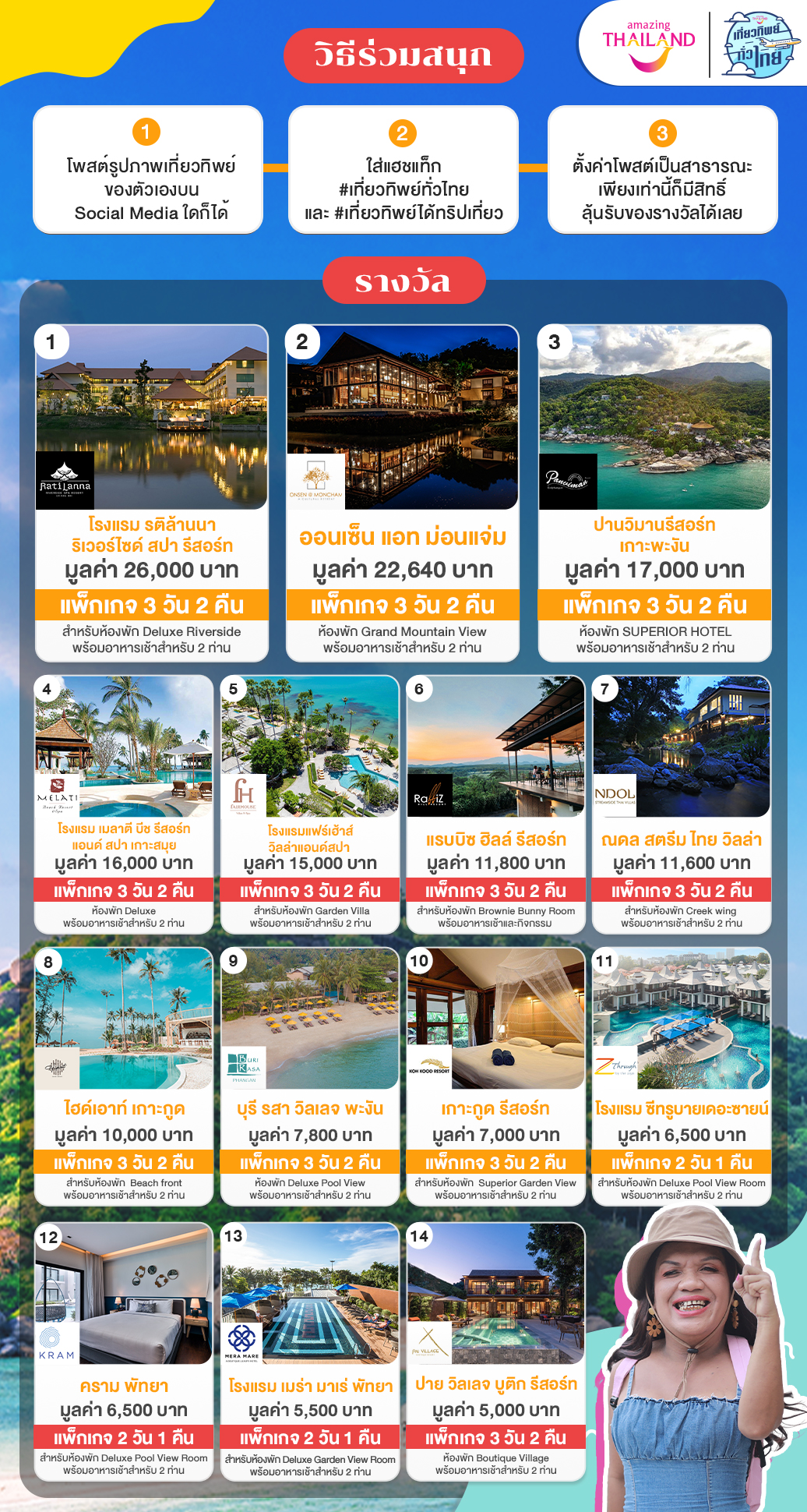 สำหรับผู้ที่สนใจร่วมสนุกกับแคมเปญ “เที่ยวทิพย์ทั่วไทย” สามารถโพสต์รูปภาพเที่ยวทิพย์ของตนเองลงบน Social Media พร้อมใส่ #เที่ยวทิพย์ทั่วไทย และ #เที่ยวทิพย์ได้ทริปเที่ยว เพื่อลุ้นรับแพ็กเกจที่พักสุดหรู รวมมูลค่ากว่า 100,000 บาท ร่วมสนุกได้ตั้งแต่ วันนี้ – 30 มิถุนายน พ.ศ. 2564