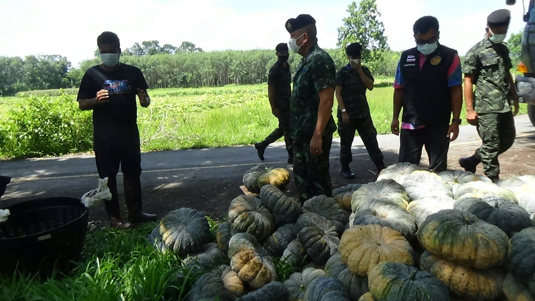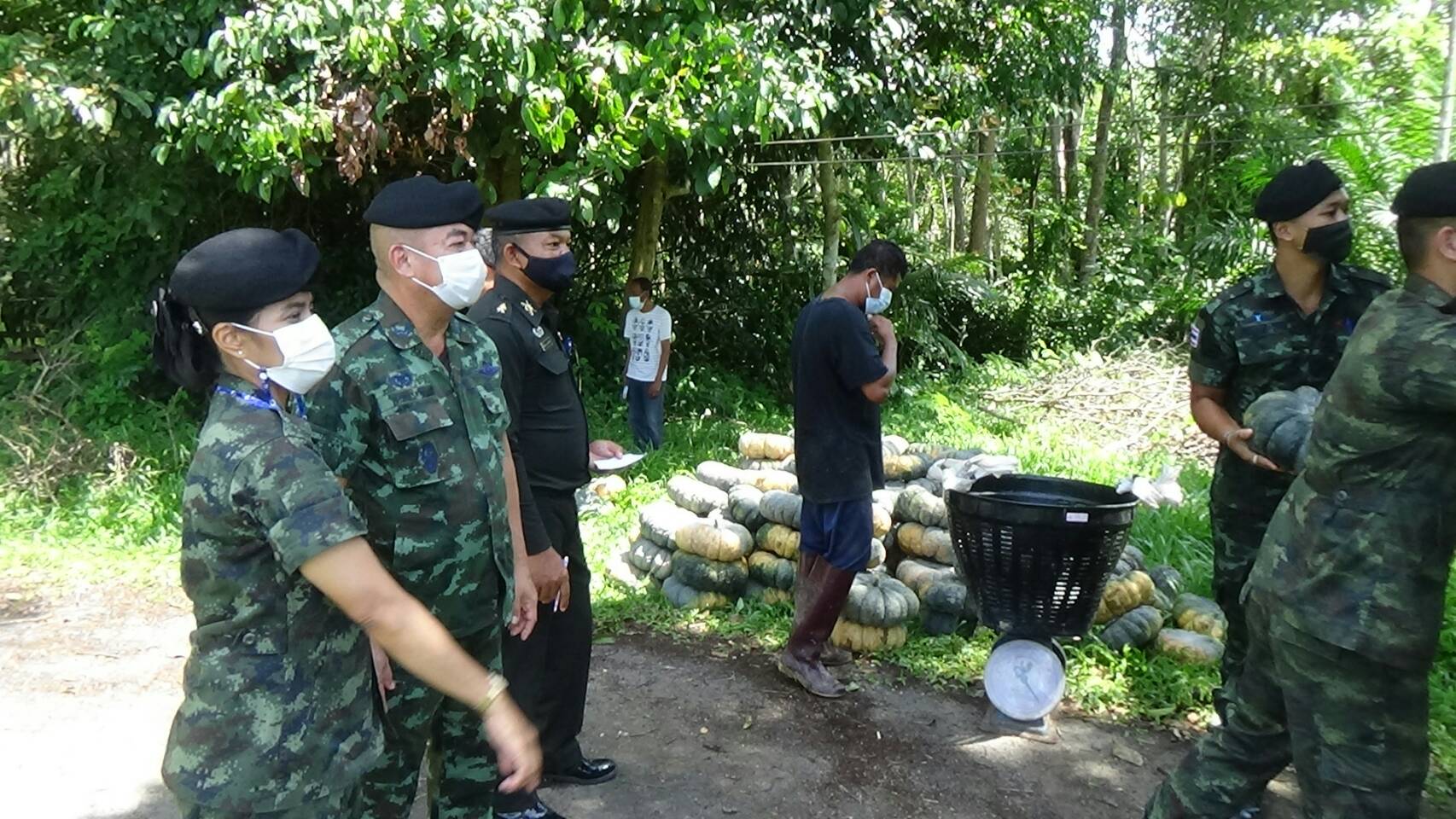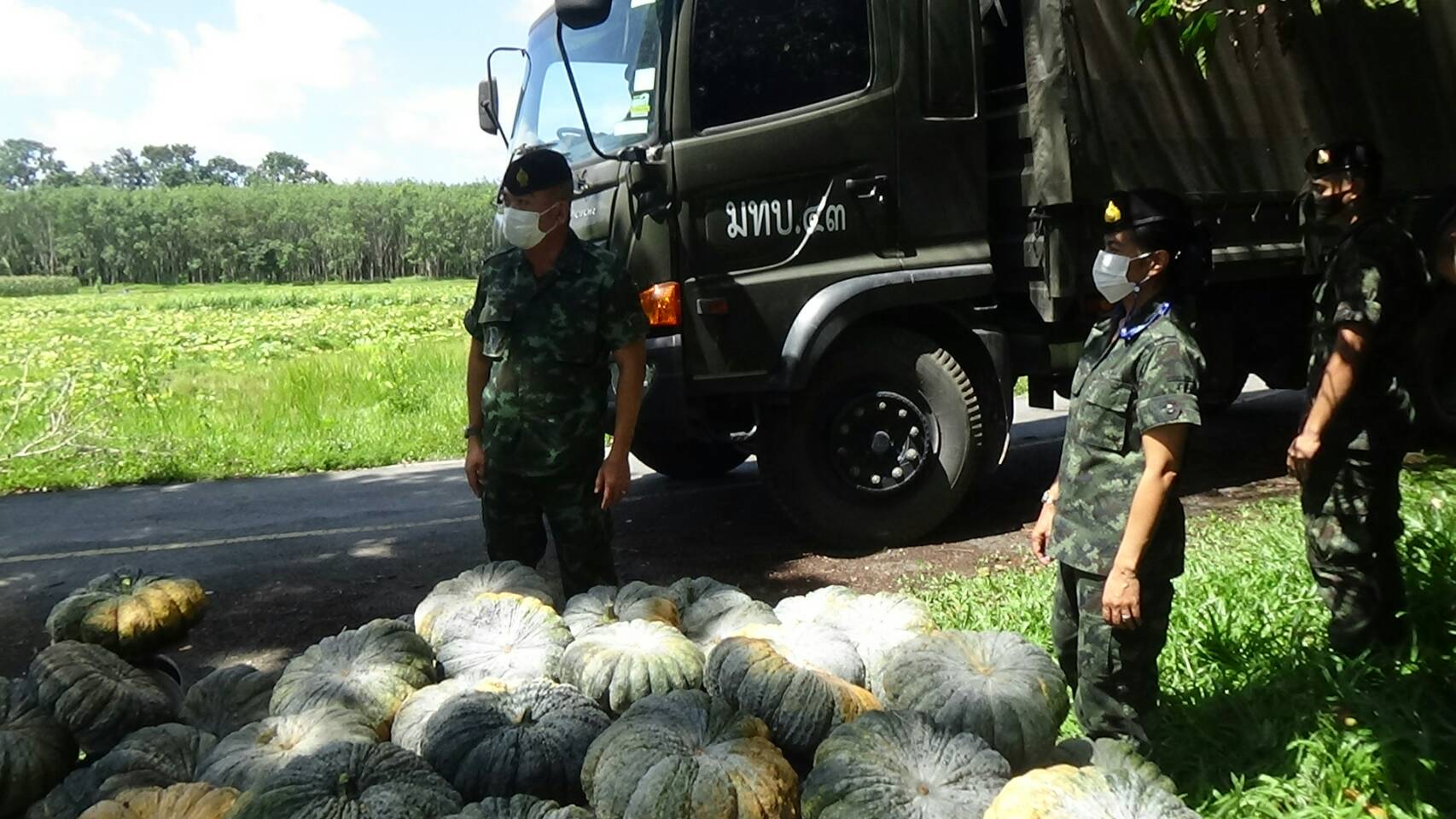 มณฑลทหารบกที่ 43 ค่ายเทพสตรีศรีสุนทร อำเภอทุ่งสง จังหวัดนครศรีธรรมราช เดินทางมาซื้อฟักทองในพื้นที่จังหวัดตรัง เพื่อช่วยเหลือเกษตรกรที่กำลังเดือดร้อนที่ประสบปัญหาพืชผลทางการเกษตรตกต่ำ เนื่องจากได้รับผลกระทบจากการแพร่ระบาดโควิด -19 ตามนโยบายของผู้บัญชาการทหารบก