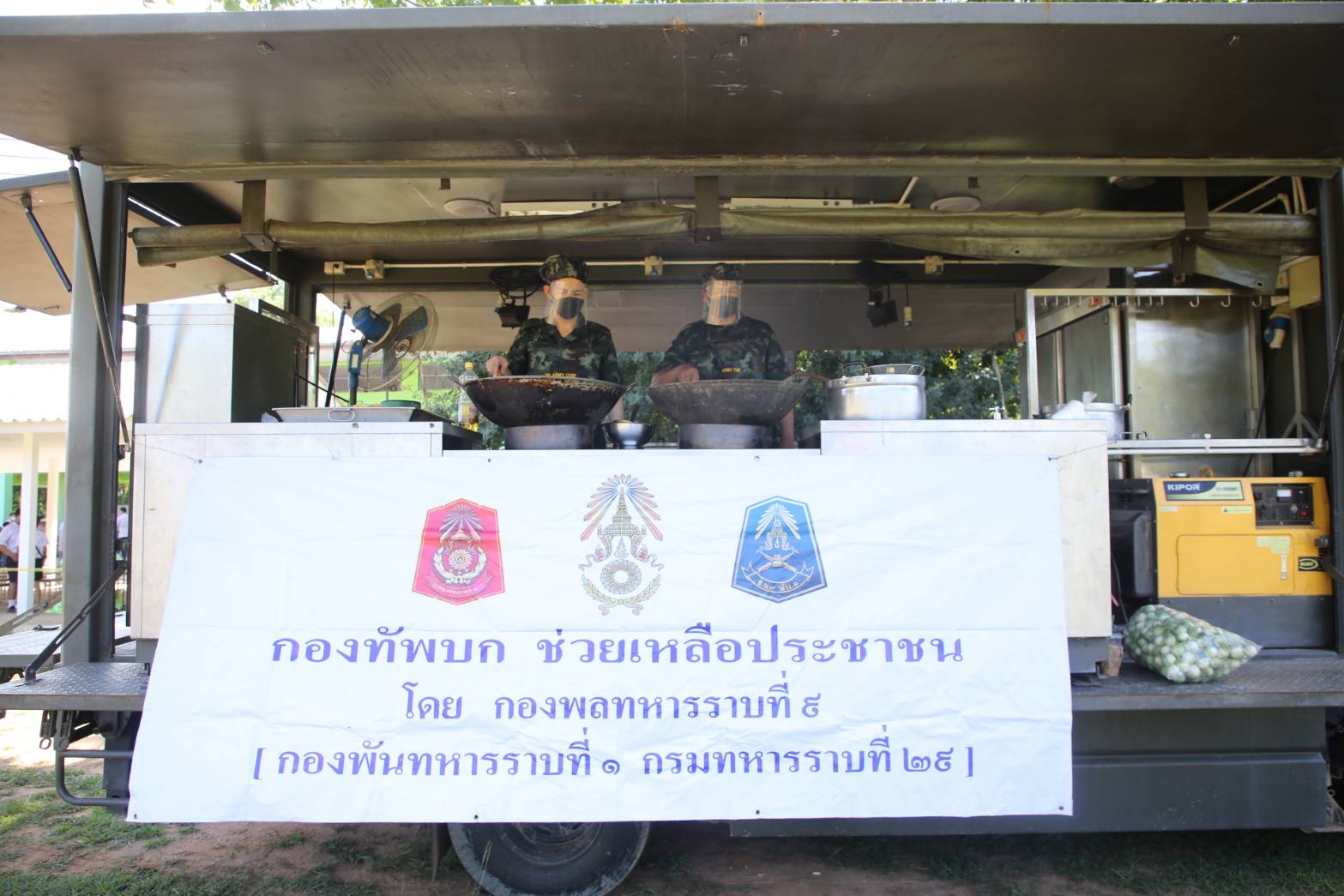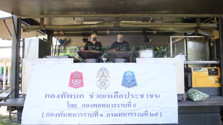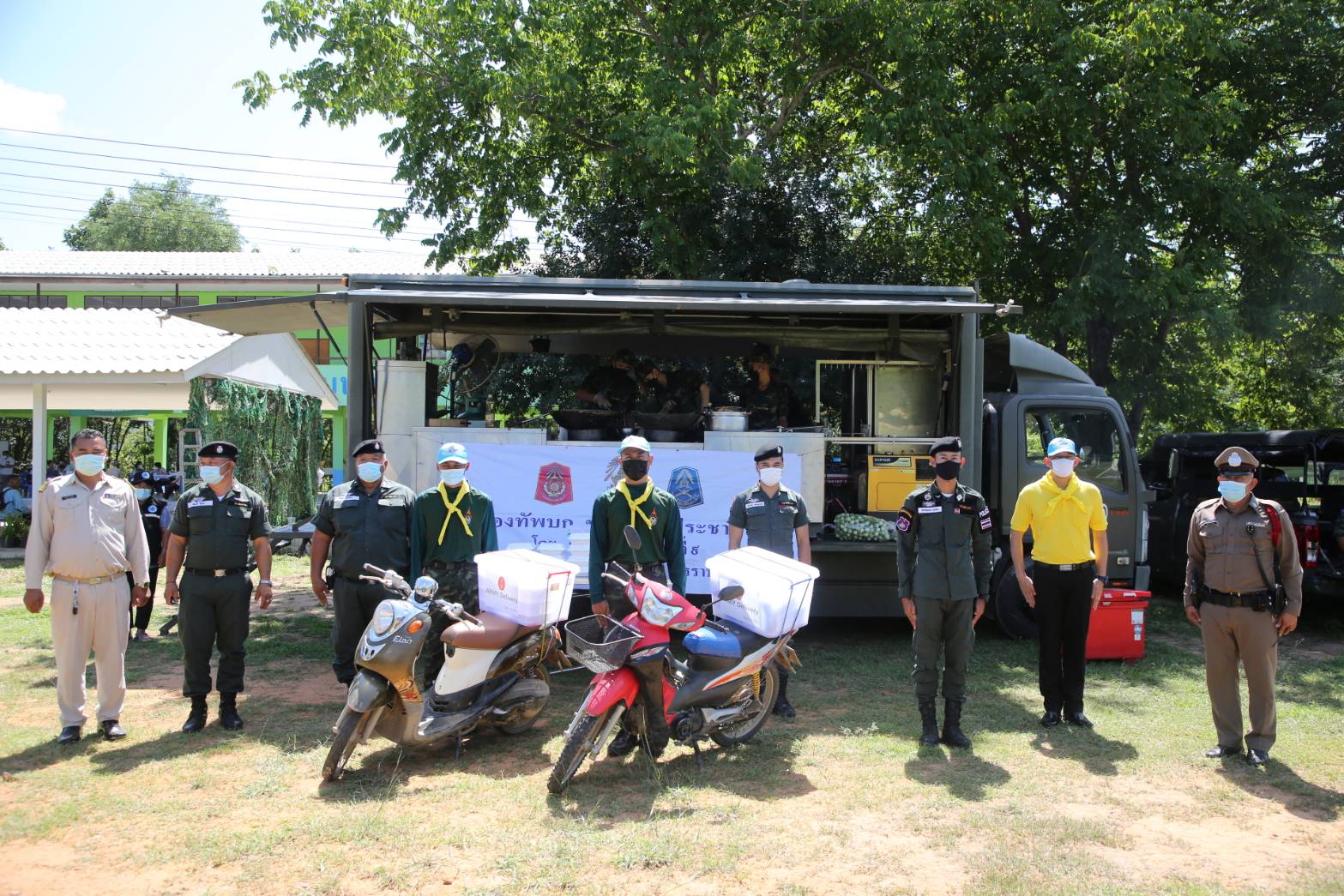กองพันทหารราบที่ 1 กรมทหารราบทหาร 29 นำรถครัวสนาม มาประกอบอาหารสดใหม่ มอบให้แก่ประชาชน เจ้าหน้าที่ และ แพทย์ พอ.สว.ที่มาให้บริการประชาชน นำทีมช่างตัดผมมาให้บริการตัดผมฟรีให้แก่ประชาชน พร้อมทั้งได้นำเจ้าหน้าที่ทหารทำความสะอาดด้วยการตัดหญ้าสนามเด็กเล่น พร้อมทั้งฉีดยาฆ่าเชื้อโรคไวรัสโควิด 19 ตามห้องเรียนต่างๆอย่างทั่วถึง เพื่อป้องกันโรคไม่ให้แพร่ระบาดลงสู่เด็กนักเรียนในช่วงเปิดภาคเรียน