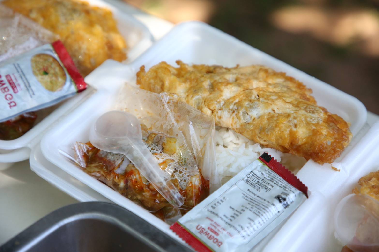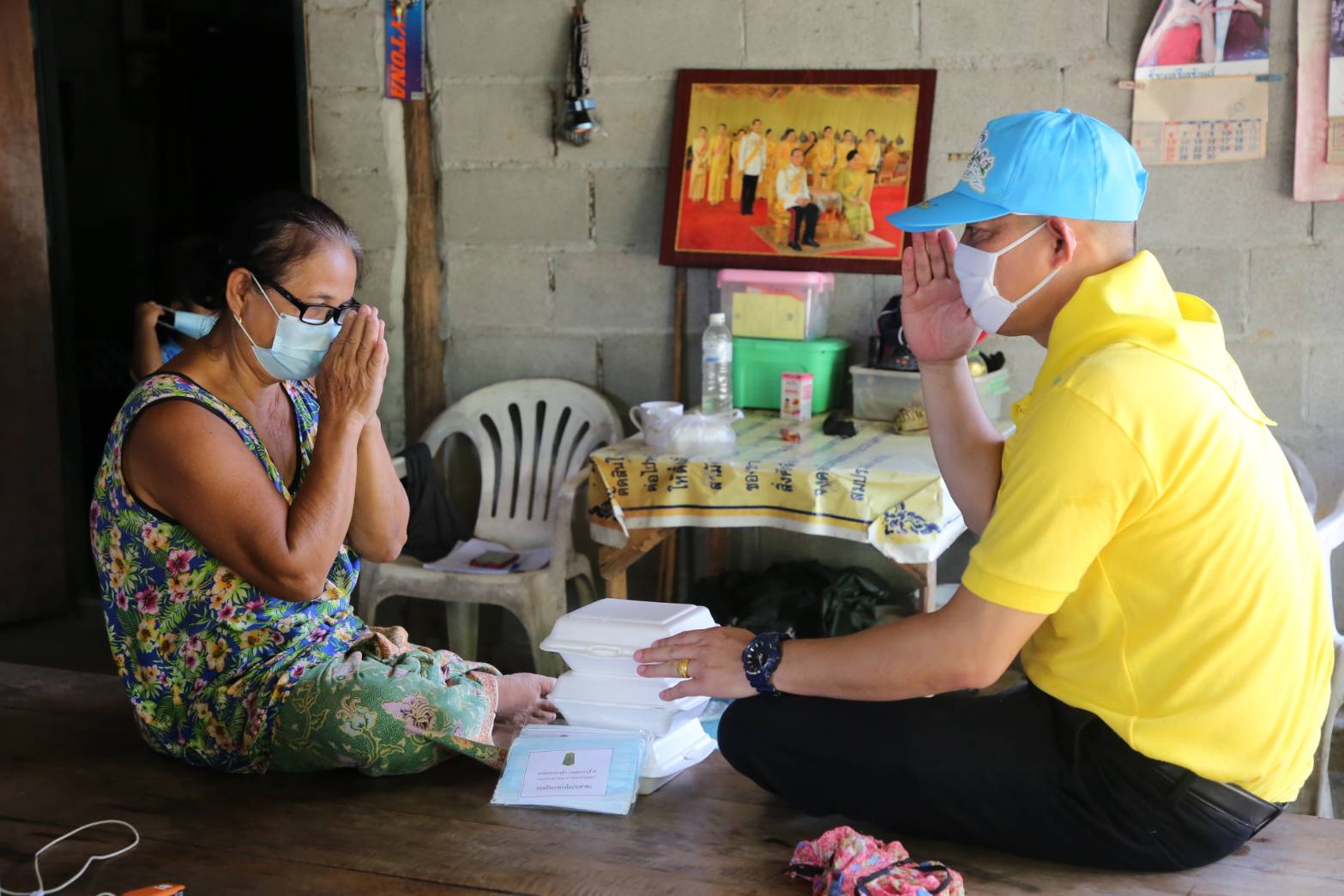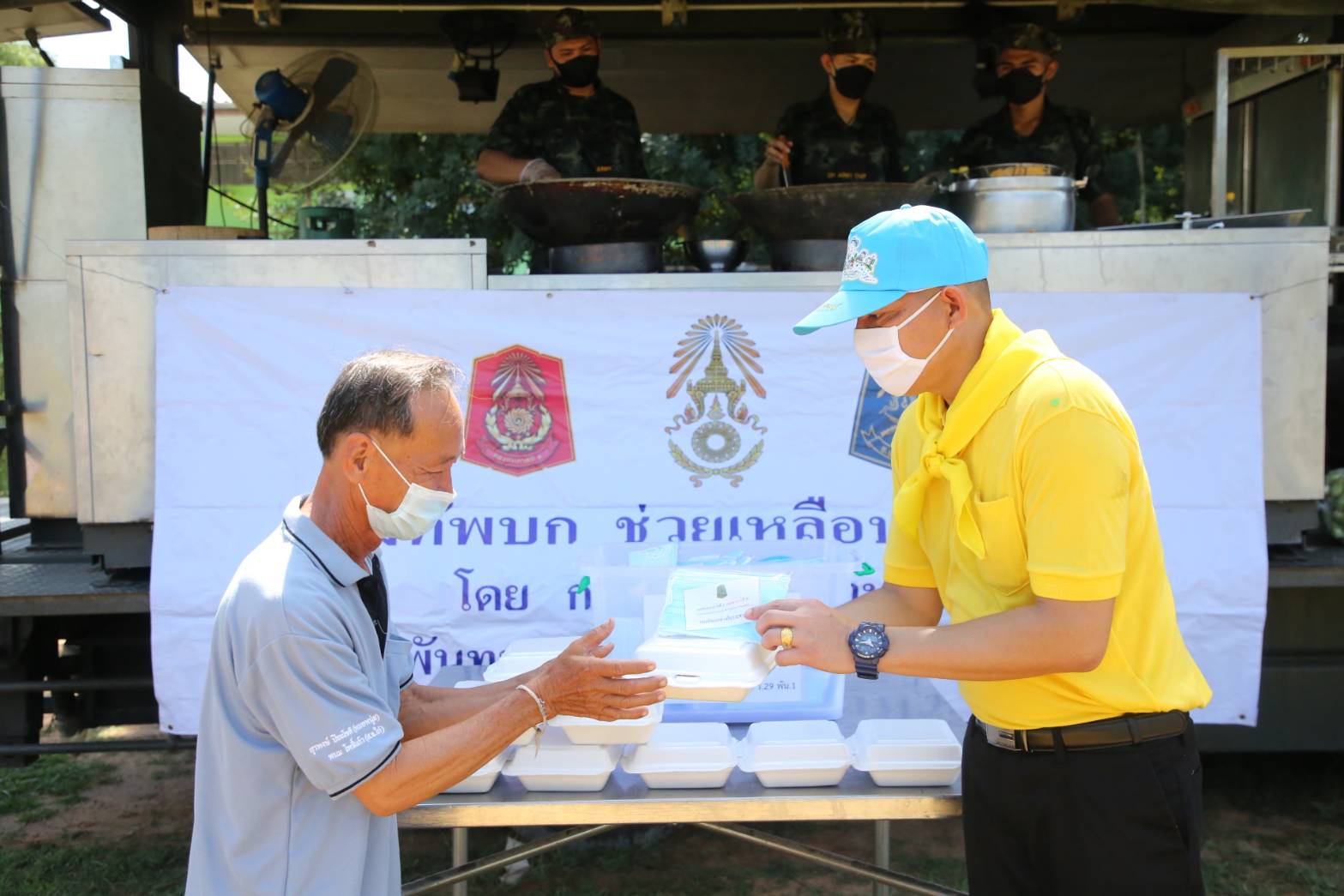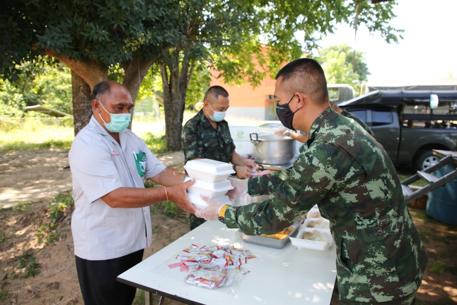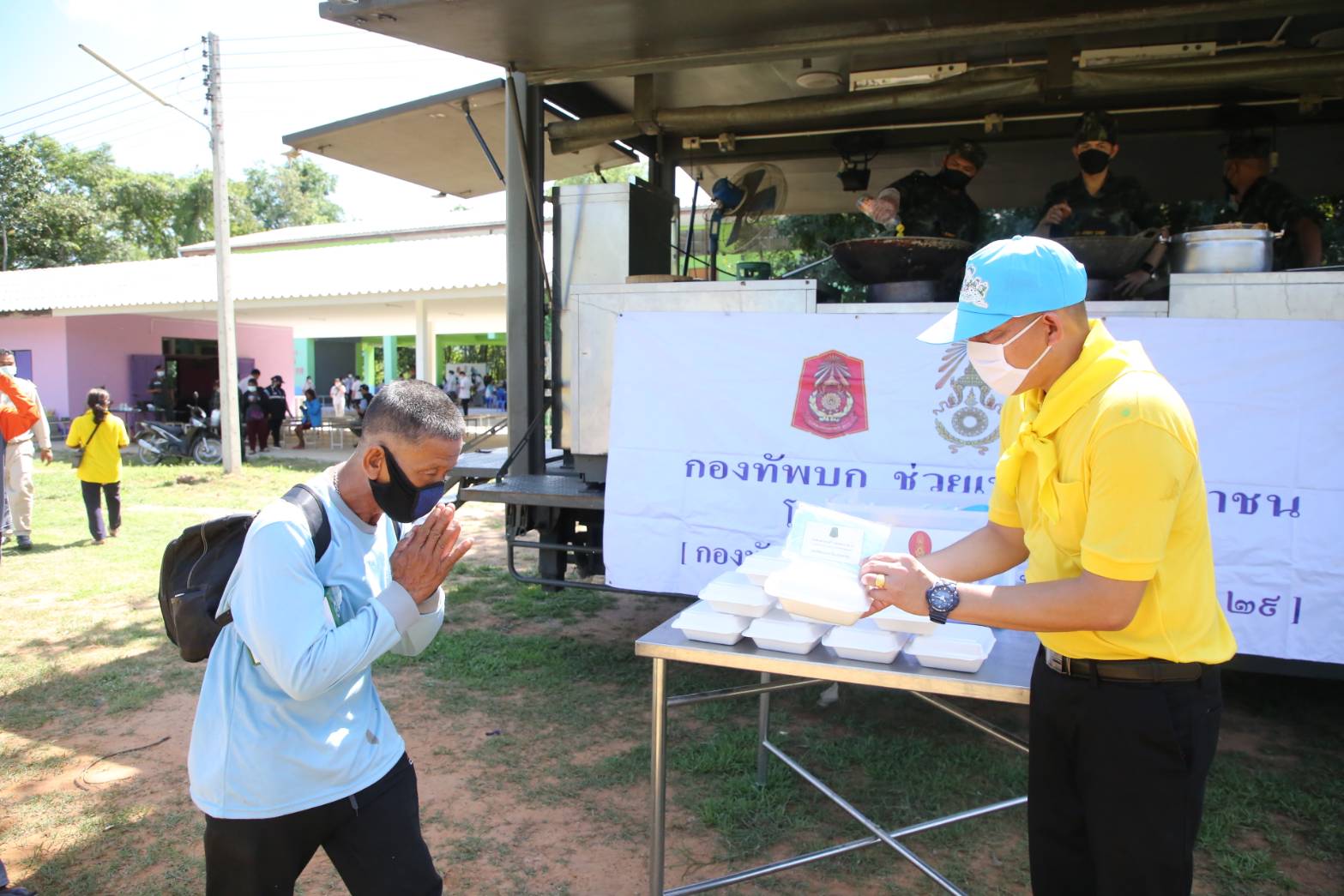 ต่อจากนั้น ได้นำ อาหารกล่อง ที่ปรุงสุกใหม่ เช่น ไข่เจียวหมูสับ แกงมะเขือกับไก่ นำลงบรรจุกล่องใส่ท้ายมอเตอร์ไซ้ นำออกแจกจ่ายให้แก่คนชราและผู้ป่วยติดเตียงพร้อมผู้ยากไร้ในพื้นที่ตามแนวชายแดน