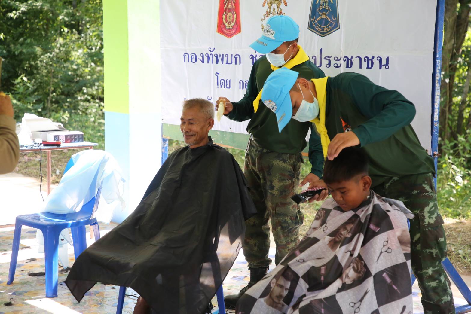 กาญจนบุรี กองพลทหารราบที่ 9 นำกิจกรรมร่วมกับแพทย์อาสาสมเด็จพระศรีนครินทราบรมราชนนี (พอ.สว. )ให้บริการประชาชน ทั้งตรวจรักษาโรค และบริการตัดผมฟรีพร้อมพัฒนาโรงเรียนและฉีดยาฆ่าเชื้อโควิด 19