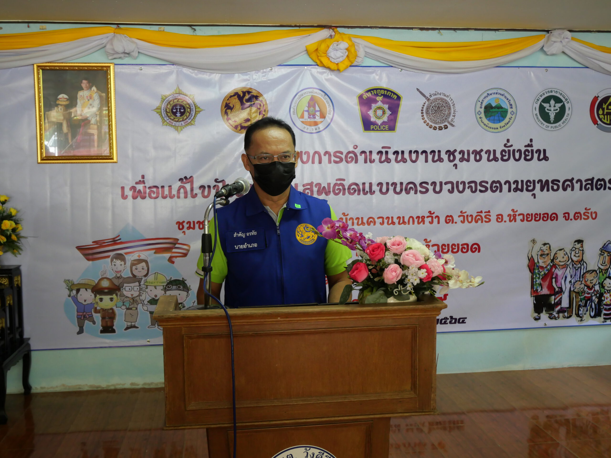 ที่หมู่ที่ 6 บ้านควนนกหว้า ต.วังคีรี อ.ห้วยยอด จ.ตรัง นายสำคัญ อรทัย นายอำเภอห้วยยอด เป็นประธานในพิธีเปิดโครงการดำเนินงานชุมชนยั่งยืน เพื่อแก้ไขปัญหายาเสพติดแบบครบวงจรตามยุทธศาสตร์ชาติ พ.ต.อ.ประดิษฐ์ ชัยพล ผู้กำกับการสถานีตำรวจภูธรห้วยยอด กล่าวว่า ตามที่ตำรวจภูธรภาค 9 ได้มอบหมายให้สถานีตำรวจภูธรห้วยยอด ดำเนินงานโครงการดำเนินงานชุมชนยั่งยืน เพื่อแก้ไขปัญหายาเสพติดแบบครบวงจรตามยุทธศาสตร์ชาติ โดยให้ดำเนินการแก้ไขปัญหาการแพร่ระบาดของยาเสพติดในชุมชน/หมู่บ้าน โดยเสริมสร้างให้ชุมชนเกิดความเข้มแข็งเข้าใจและรับรู้ปัญหาพิษภัยที่เกิดขึ้นจากยาเสพติด เพื่อให้เกิดกระบวนการป้องกันแก้ไขและการบำบัดยาเสพติด